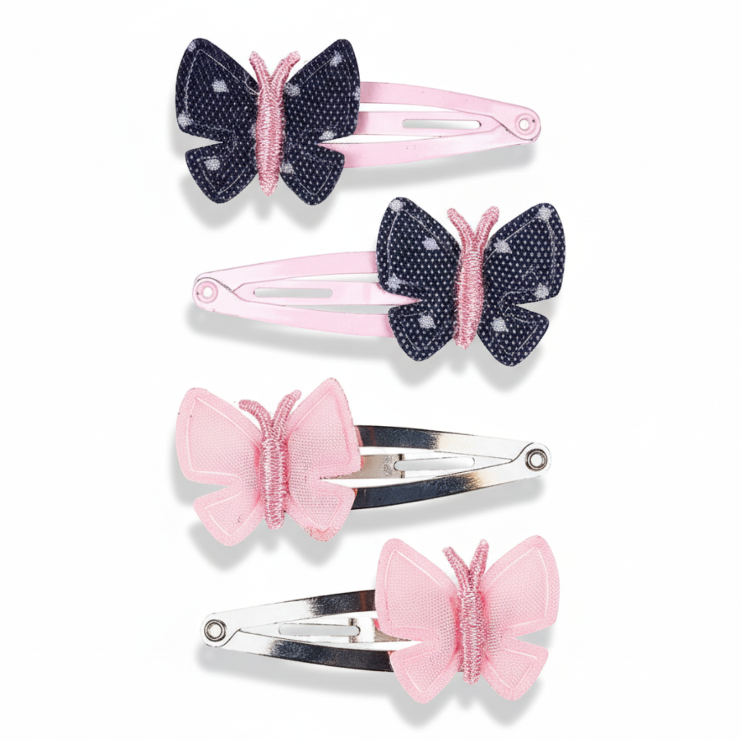 Dwie są srebrne z motylami w kolorze różowym, kolejne dwie – metaliczno-różowe z granatowymi motylami w jasne kropeczki. Metalowe zaciski na klik sprawiają, że ozdoby stabilnie trzymają się włosów. Idealne zarówno na przyjęcia, jak i na co dzień. Nadają się także na prezent.