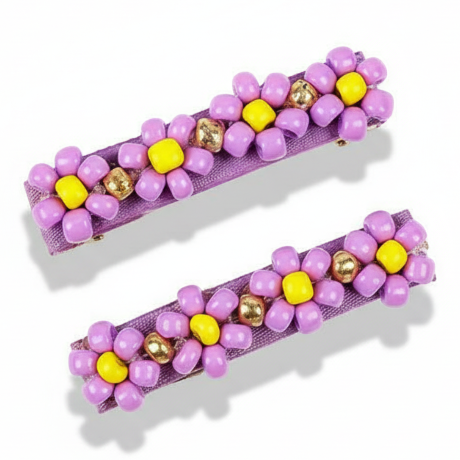Spinki zdobią kwiatki z fioletowych, złotych i żółtych koralików. Metalowa część spinek pokryta jest materiałem (rypsową wstążką). Ząbkowane zaciski sprawiają, że ozdoby stabilnie trzymają się włosów. Idealne zarówno na przyjęcia, jak i na co dzień. Nadają się także na prezent.