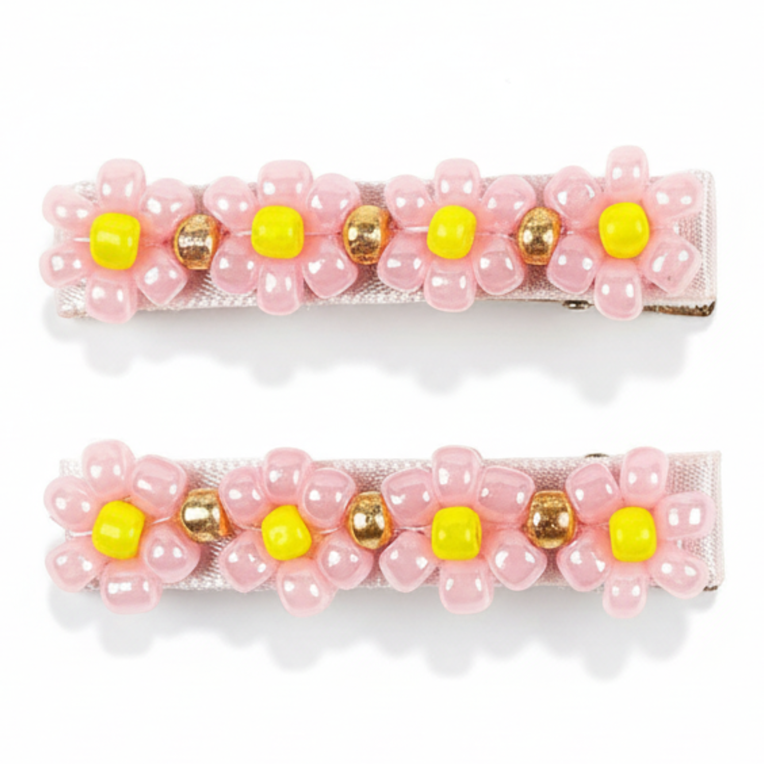 Spinki zdobią kwiatki z różowych, złotych i żółtych koralików. Metalowa część spinek pokryta jest materiałem (rypsową wstążką). Ząbkowane zaciski sprawiają, że ozdoby stabilnie trzymają się włosów. Idealne zarówno na przyjęcia, jak i na co dzień. Nadają się także na prezent.