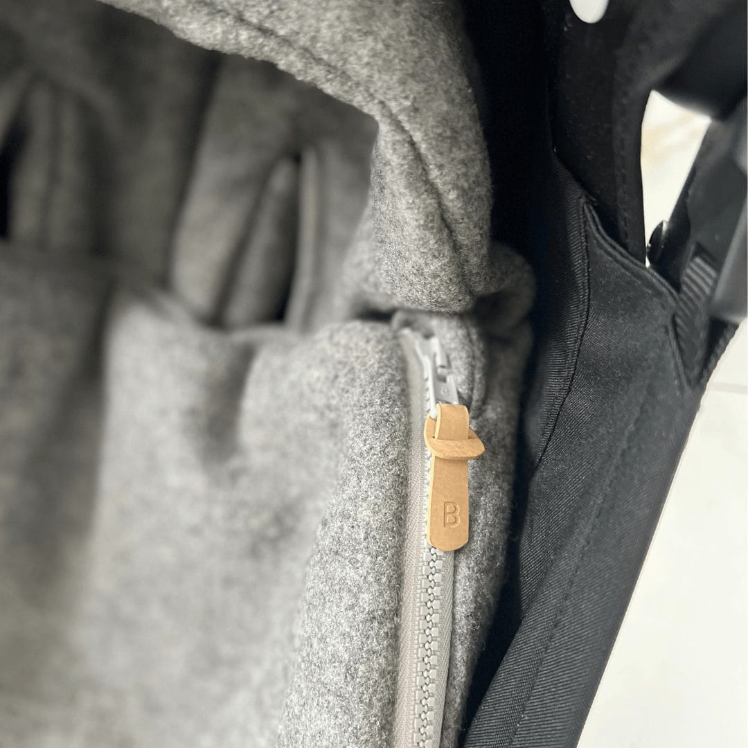 Śpiworek do fotelika i gondoli Robin Chudek zakończony jest eleganckimi skórzanymi zaczepami, ze skórzanym logo.
