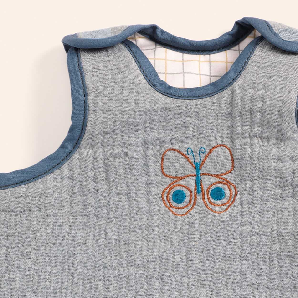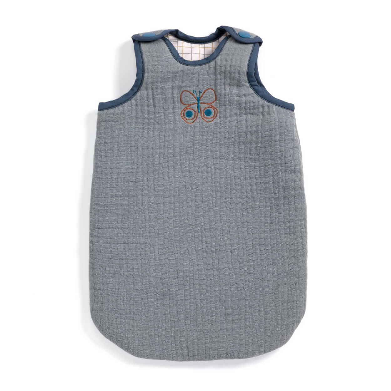 Śliczny, szary śpiworek z wyhaftowanym motylkiem, by bobas w postaci lalki dobrze się wyspał i nie odkrywał się w nocy! Dzięki zatrzaskom na ramionach bardzo łatwo wsunąć do niego swoją lalkę. Śpiwór wykonany jest z miękkiej, grubszej bawełny w środku, a na zewnątrz z podwójnego muślinu.