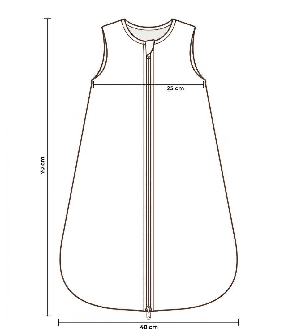 - 0-5 miesięcy – 1.0 TOG oraz 2.5 TOG – długość 70 cm, szerokość 40 cm, szerokość pod paszkami 25 cm;