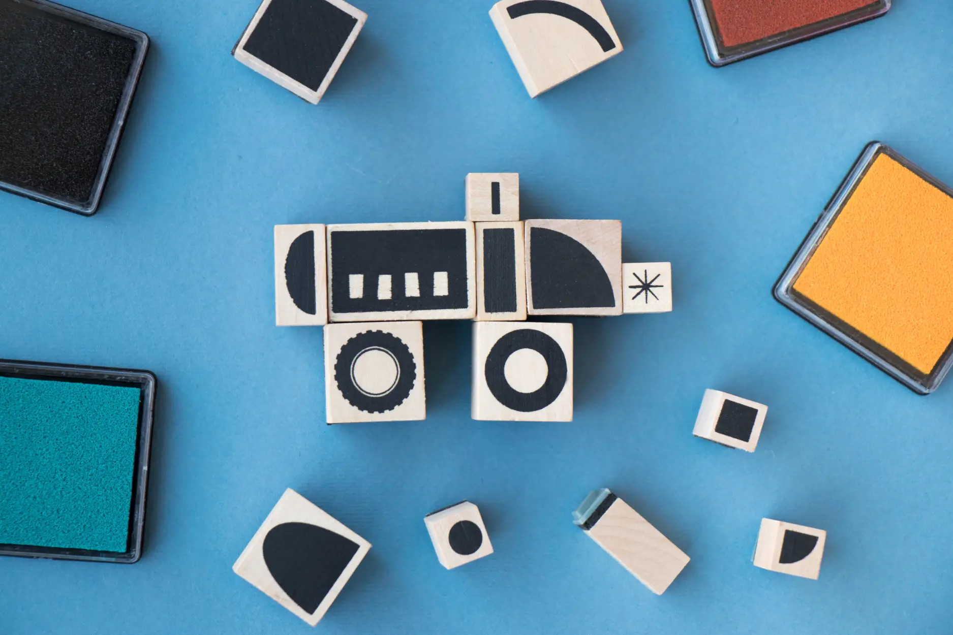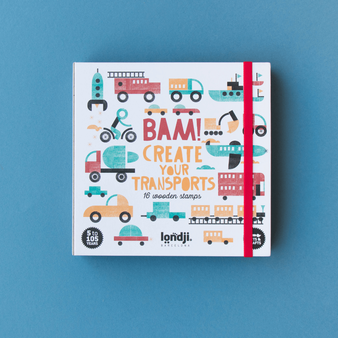 Twórz różne pojazdy transportowe za pomocą drewnianych stempelków! Samochody, samoloty, rakiety, pociągi... Ile dziecięca wyobraźnia podpowie