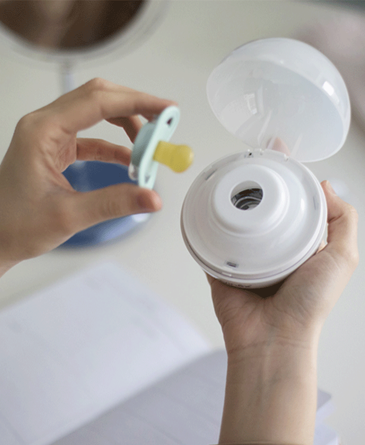 Sterylizator do smoczków uspokajaczy, to poręczne urządzenie, które dzięki światłu ultrafioletowemu (UV) eliminuje zarazki znajdujące się na smoczkach. I to w zaledwie 3 minuty! Sterylizator jest kompatybilny z każdym rodzajem smoczka. Zasilanie urządzenia to baterie lub kabel USB. Sterylizator jest mały i lekki zatem idealny do zabrania poza dom czyli na spacer, wyjazd czy wakacje.