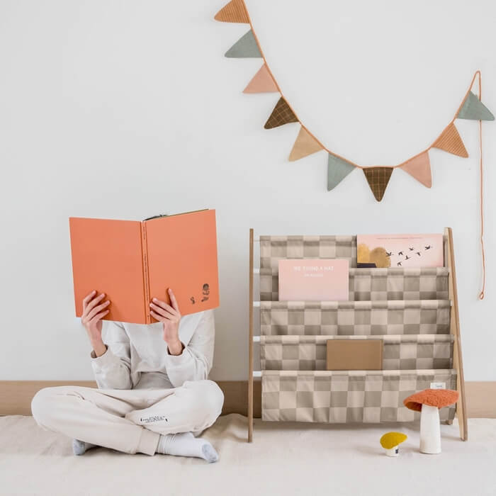 Stojak na książki dostosowany do wzrostu dziecka utrzymuje ulubione pozycje na poziomie jego wzroku. Stojak na książki został wykonany w 100% z poliestru pochodzącego z recyklingu.