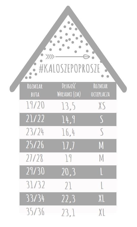 Dla przykładu, jeśli Twoje dziecko nosi buty innych marek w rozmiarze 21/22, to prawdopodobnie idealne dla niego będą kalosze o rozmiar mniejsze, czyli 19/20.