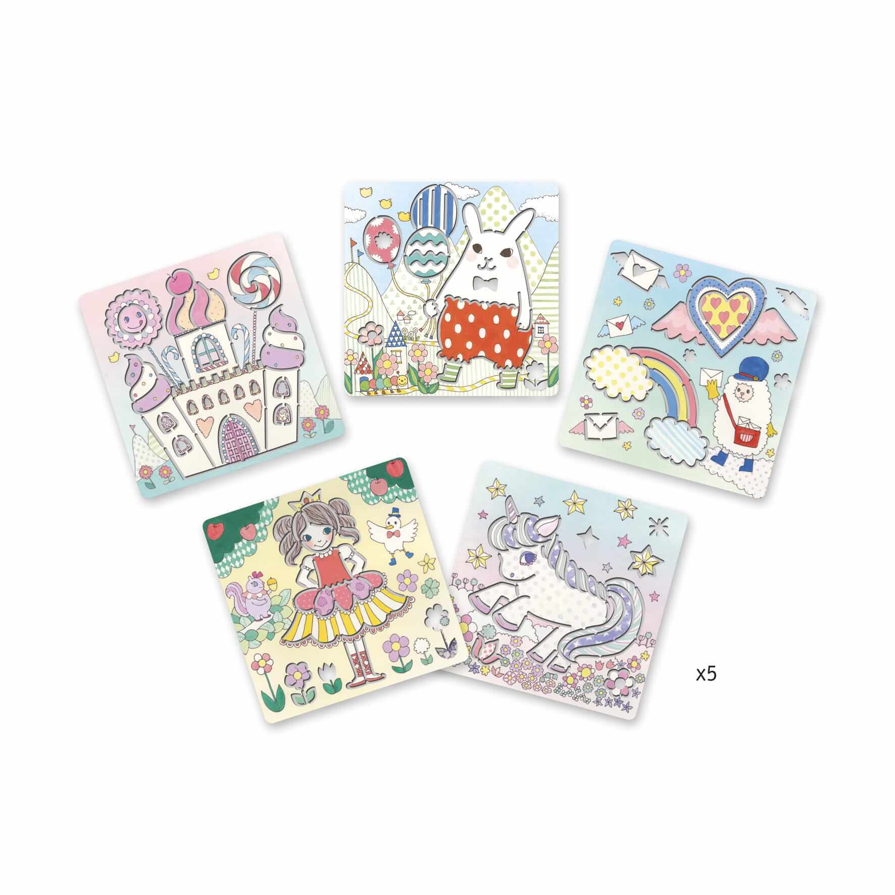 Zestaw 5 plastikowych kolorowych arkuszy w wyciętymi "rowkami " przedstawiającymi różne postacie zwierzątek