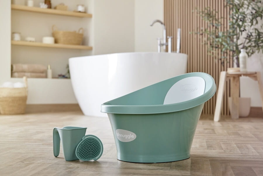 Miękkie silikonowe włoski szczotki Shnuggle pomagają delikatnie myć główkę dziecka, złuszczając naskórek ciemieniuchy z głowy.