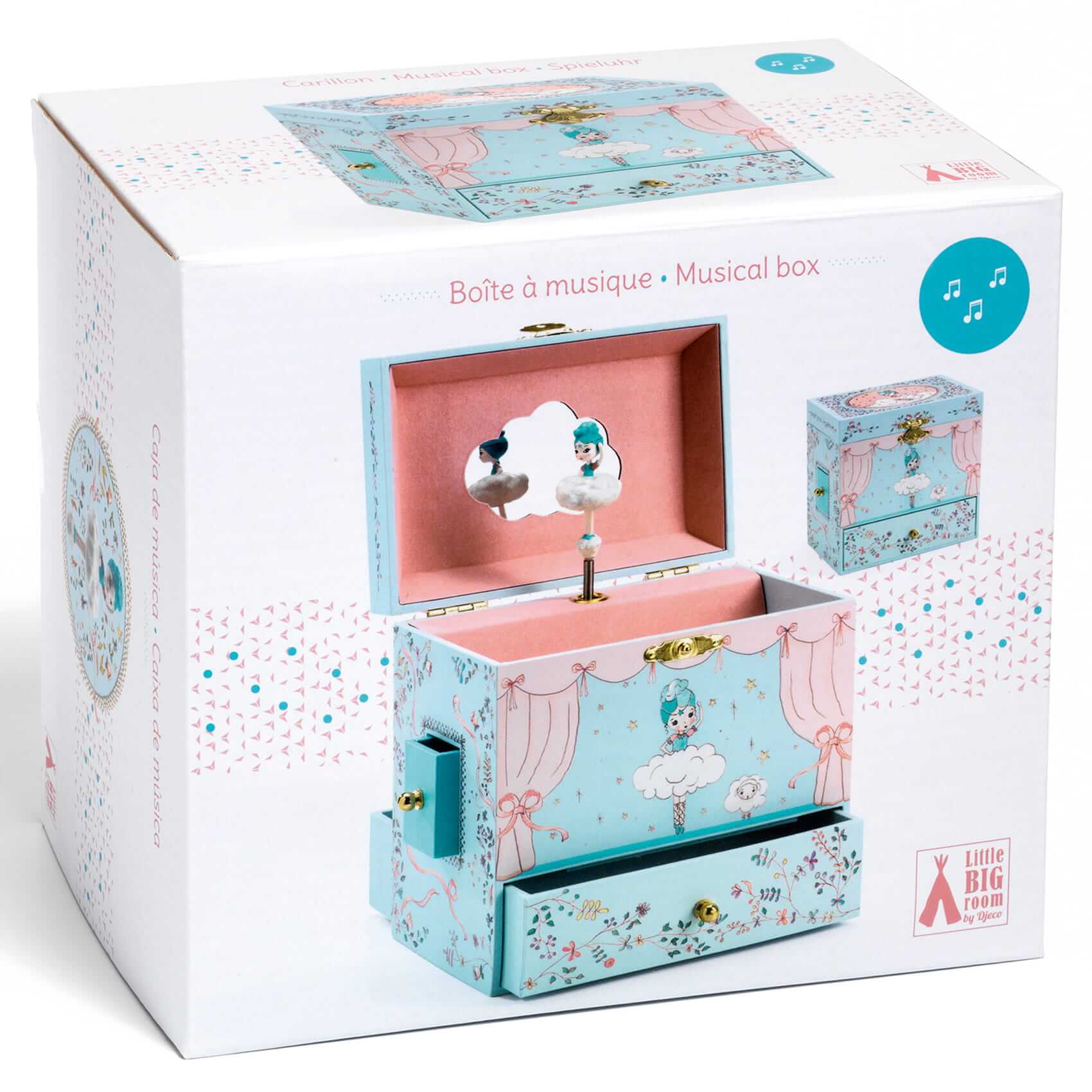 Na wierzchu motyw tańczącej BALERINY, wewnątrz lusterko i figurka BALERINY, która kręci sie grając melodyjkę. Pozytywka uruchamia sie po otwaciu wieczka. Śliczna ozdoba do dziecięcego pokoju. Melodia pozytywki: "Romance de l'amour".