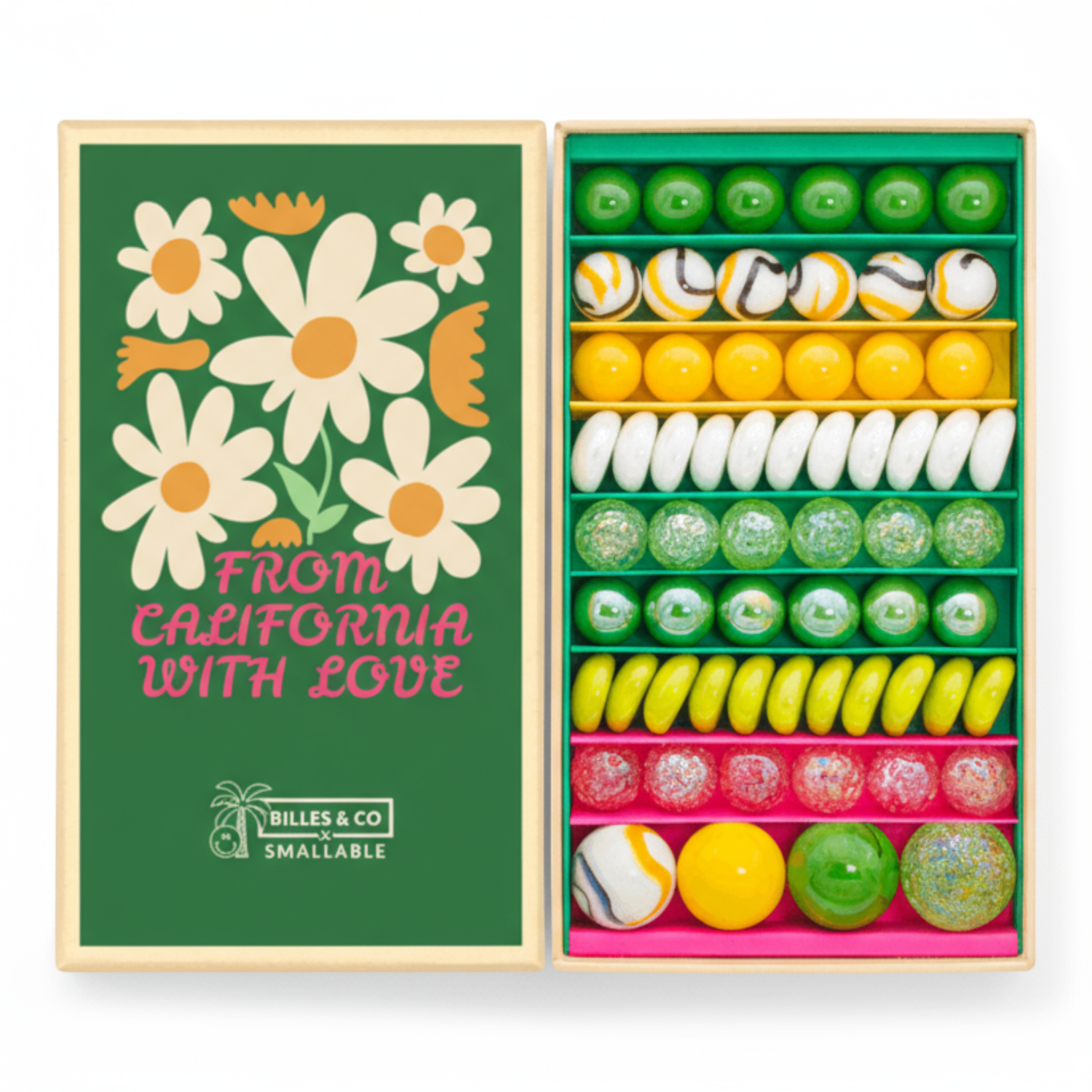 Billes&Co FROM CALIFORNIA to zestaw 62 szklanych kulek i kamyczków, kolorystycznie ułożonych w pięknie zdobionym pudełku. Przeróżne barwy, tekstury i wzory kulek posiadają hipnotyzującą moc, która nie pozwoli oderwać się od zabawy. Kulki są ułożone tematycznie, tworząc w małych pudełeczkach swoiste uniwersa. Zestaw został stworzony we współpracy z marką Smallable.
