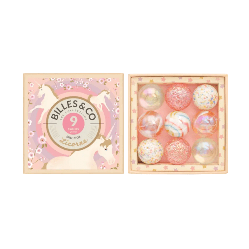 Billes&Co JEDNOROŻCE to zestaw 9 szklanych kulek o średnicy 25 mm, kolorystycznie ułożonych w pięknie zdobionym pudełku. Przeróżne barwy, tekstury i wzory kulek posiadają hipnotyzującą moc, która nie pozwoli oderwać się od zabawy. Kulki są ułożone tematycznie, tworząc w małych pudełeczkach swoiste uniwersa.