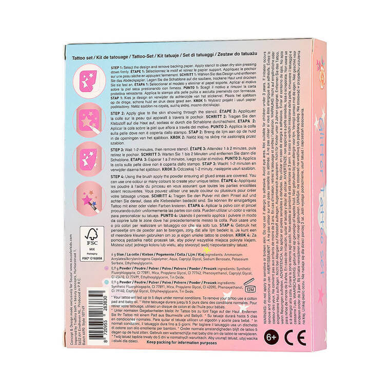 Wzory można łatwo usunąć za pomocą wacika i oliwki. Same także stopniowo zmywają się wodą przy okazji codziennego mycia. Utrzymują się do pięciu dni. Są przetestowane dermatologicznie, w pełni bezpieczne, nie uczulają i nie podrażniają skóry. Idealne na przyjęcia, urodzinki, zabawę w salon tatuażu oraz jako stylowy prezent. Zestaw zapakowany jest w urocze kartonowe pudełko z okienkami i jednorożcem.