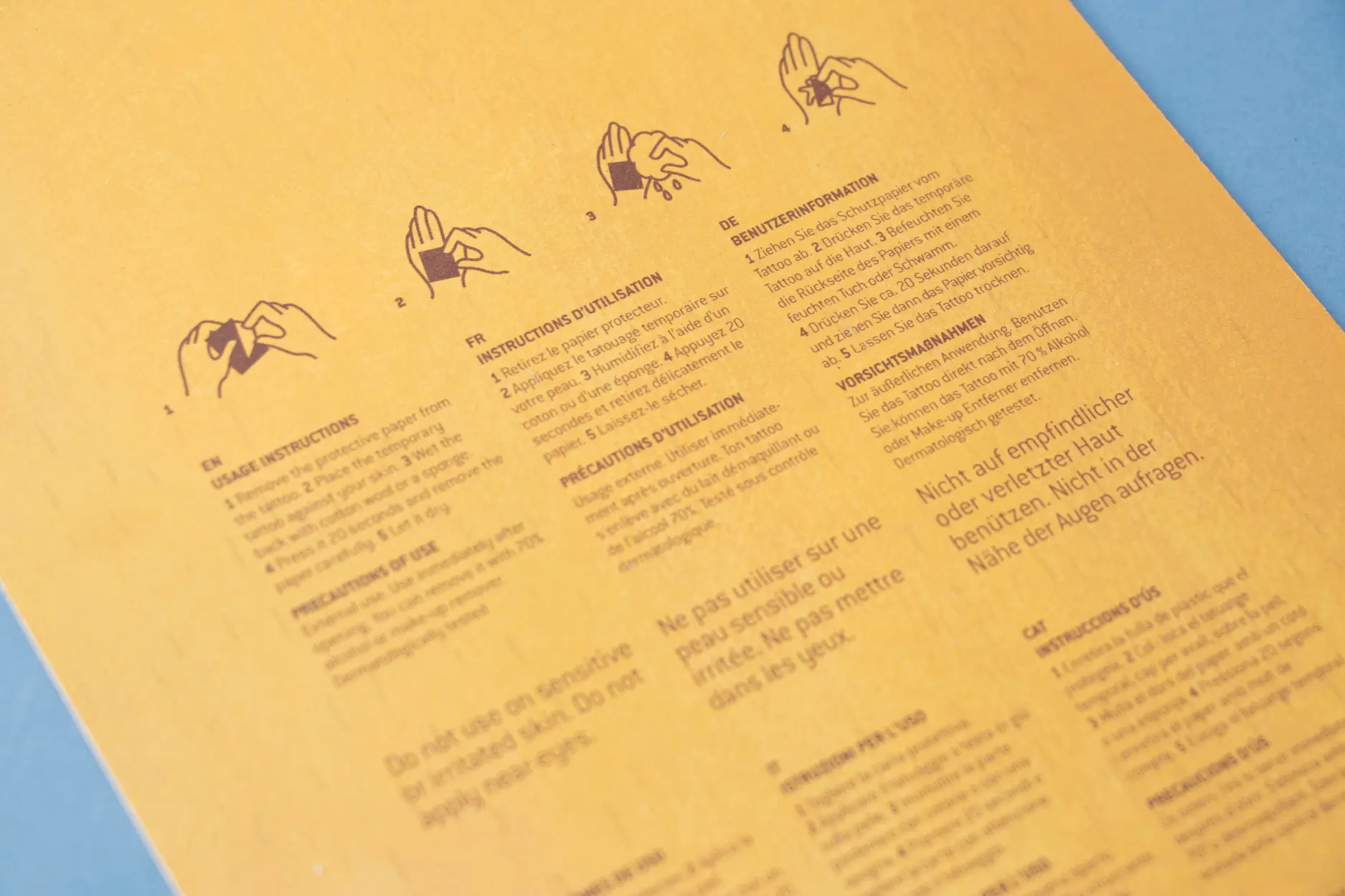 Produkcja tatuaży odbywa się w Hiszpanii, są nietoksyczne, przed wdrożeniem ich do sprzedaży pomyślnie przeszły wszelkie testy bezpieczeństwa przeprowadzone przez niezależne laboratoria badawcze, zatwierdzone przez instytucje Unii Europejskiej.
