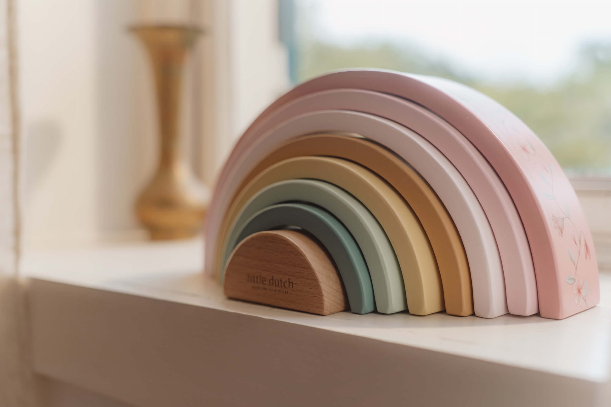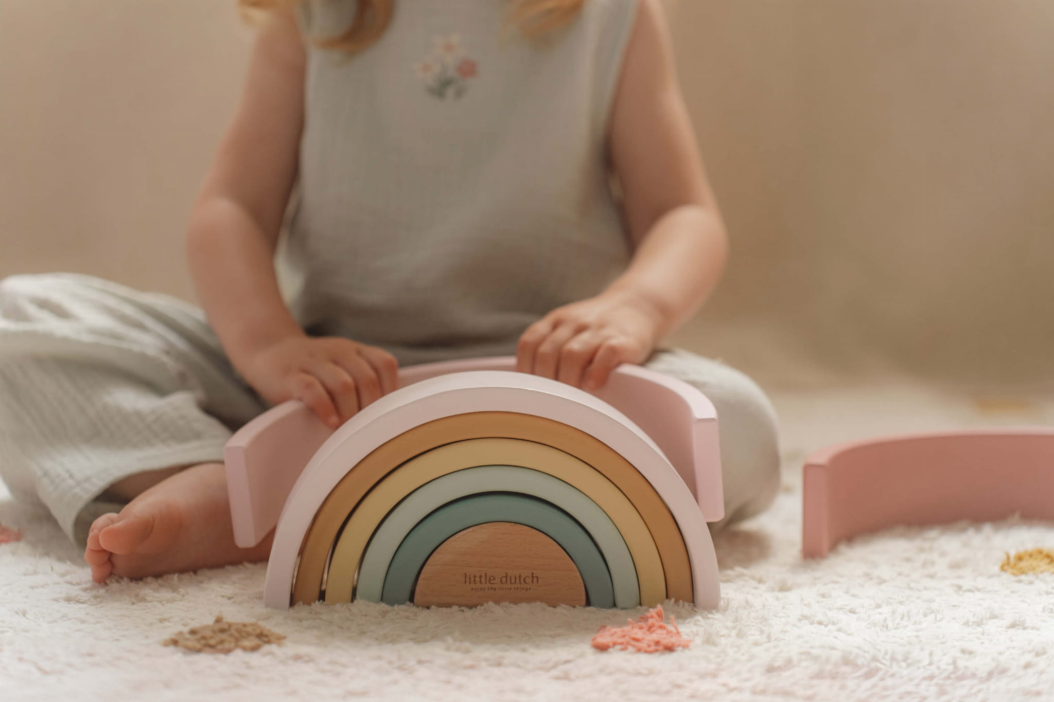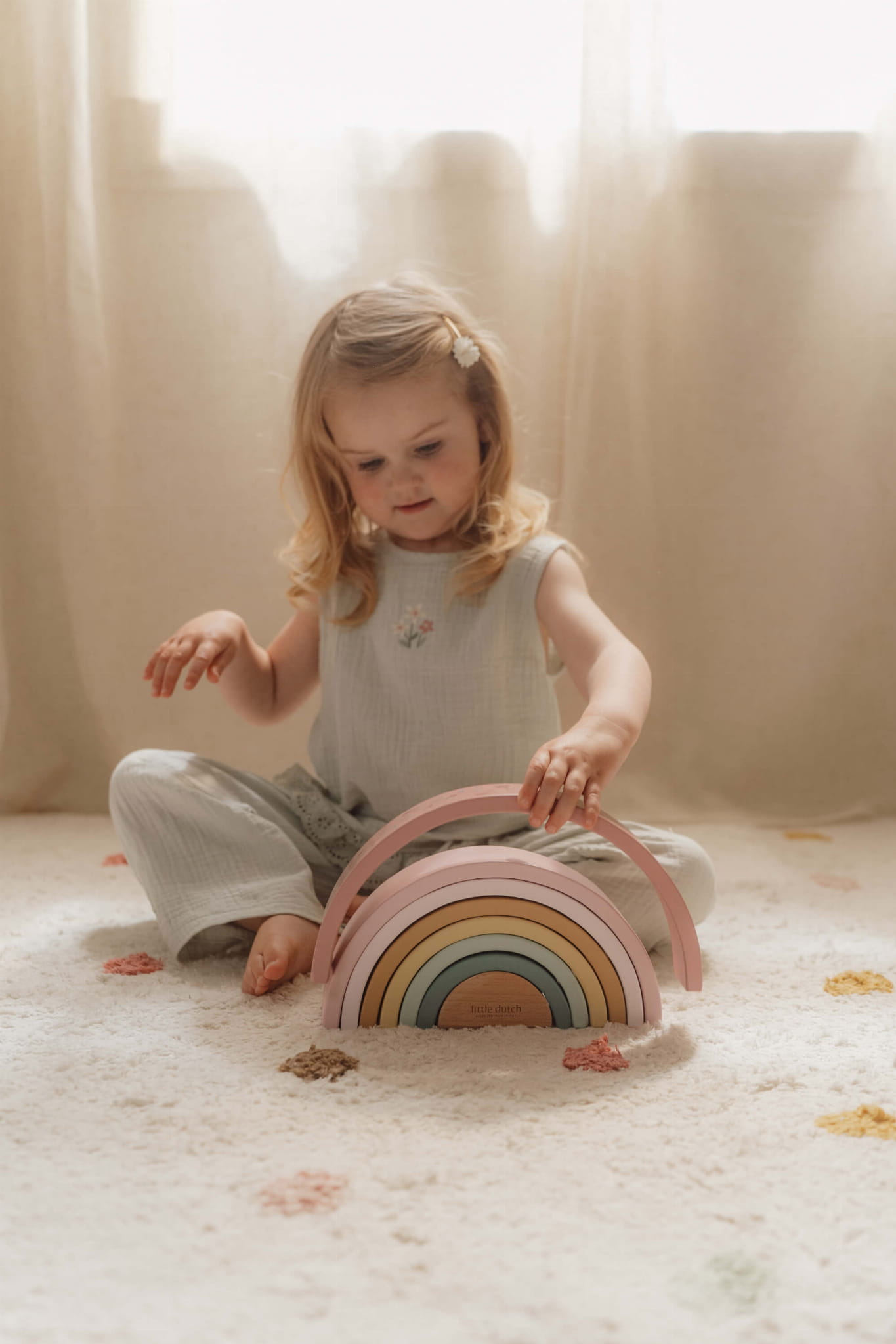 Składa się z 8 łuków w różnych rozmiarach pasujących do siebie. Ta tęczowa układanka w odcieniach różowego, żółtego i zielonego rozwija małą motorykę i wyobraźnię dzieci. Budowanie figur, tuneli kolejowych lub mostów dla małych samochodów - istnieją nieskończone możliwości kreatywne i mnóstwo niekończącej się zabawy! Tęcza będzie również uroczym elementem wystroju pokoju dziecięcego. Tęcza to świetny pomysł na prezent i doskonałe uzupełnienie dla pozostałych zabawek z kolekcji Fairy Garden od Little Dutch.