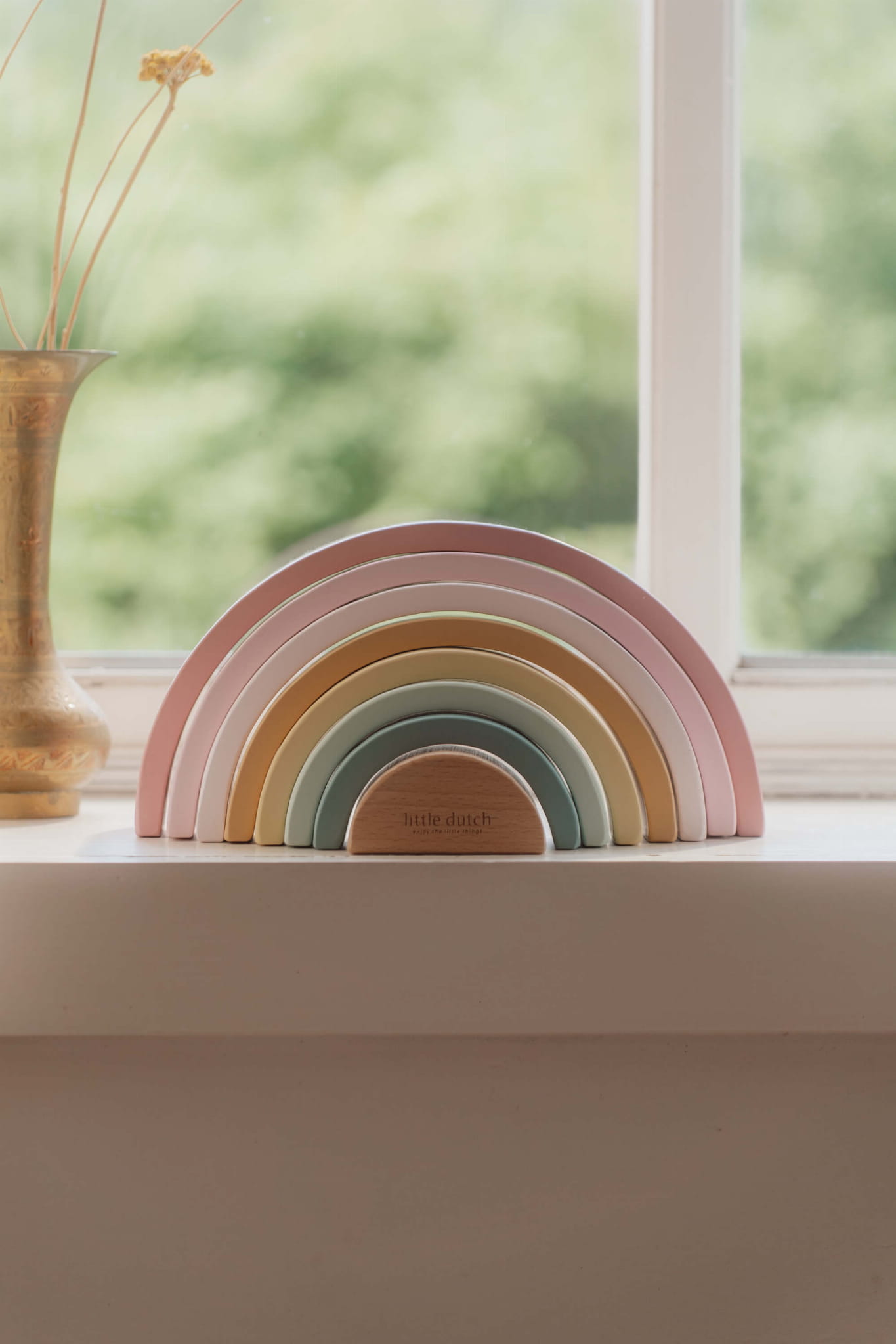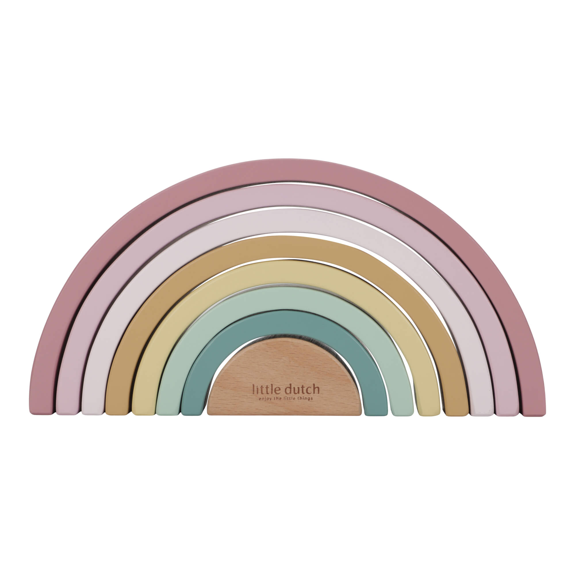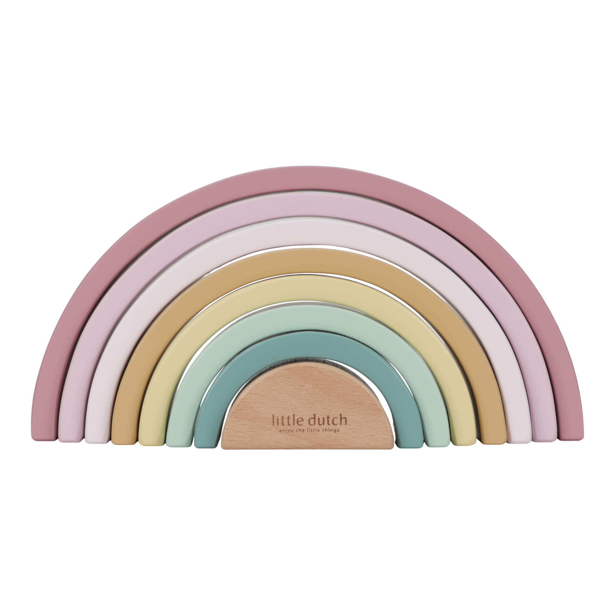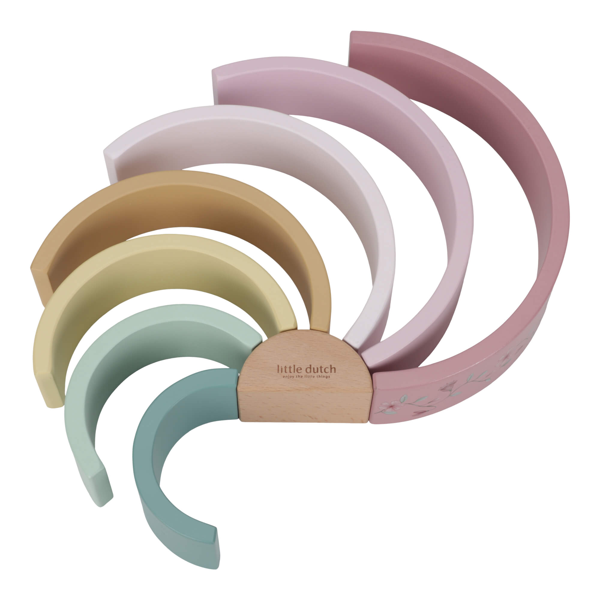 Składa się z 8 łuków w różnych rozmiarach pasujących do siebie. Ta tęczowa układanka w odcieniach różowego, żółtego i zielonego rozwija małą motorykę i wyobraźnię dzieci. Budowanie figur, tuneli kolejowych lub mostów dla małych samochodów - istnieją nieskończone możliwości kreatywne i mnóstwo niekończącej się zabawy! Tęcza będzie również uroczym elementem wystroju pokoju dziecięcego. Tęcza to świetny pomysł na prezent i doskonałe uzupełnienie dla pozostałych zabawek z kolekcji Fairy Garden od Little Dutch.