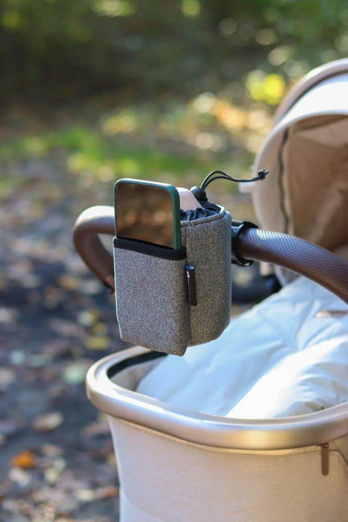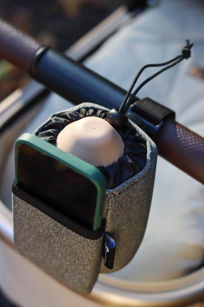 Uchwyt ten wyposażony jest w dodatkową kieszeń na telefon, co sprawia, że jest wygodny i praktyczny. Posiada uniwersalne mocowanie do rurki wózka lub roweru, które utrzymuje uchwyt stabilnie na miejscu i jest łatwe w założeniu. Uchwyt jest wszechstronny: na napoje i telefon nie tylko do wózka lub na kierownicę roweru, ale i innych pojazdów typu hulajnoga czy skuter.