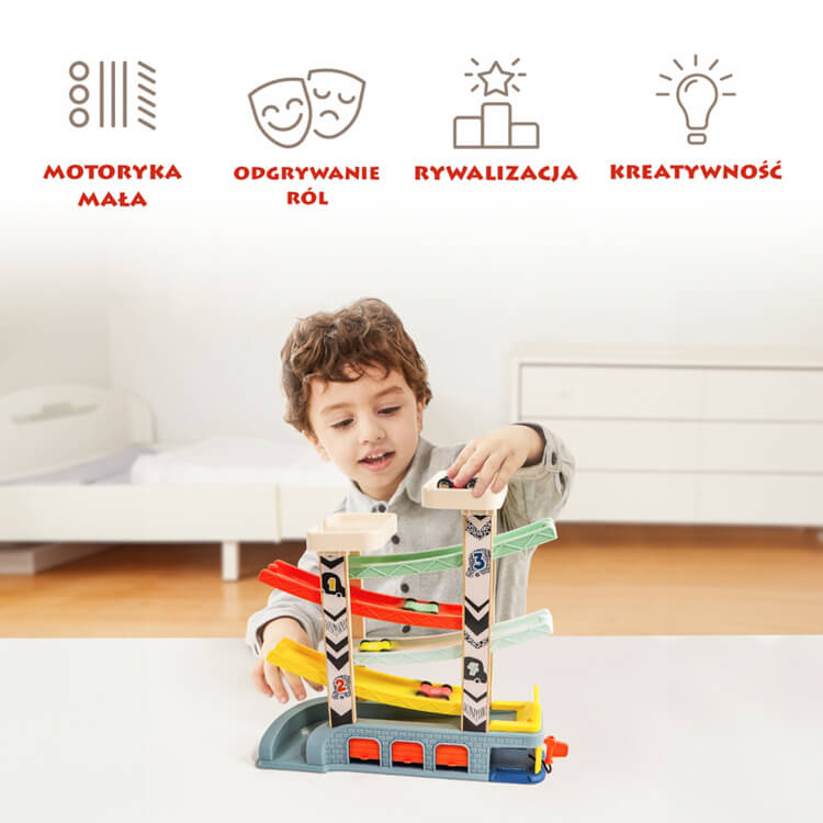 To komplet z autami, garażami, parkingami, warsztatem i stacją benzynową, który gwarantuje dzieciom wiele godzin tematycznej zabawy. Podczas przesuwania pojazdów maluchy ćwiczą koordynację oko-ręka oraz motorykę małą.