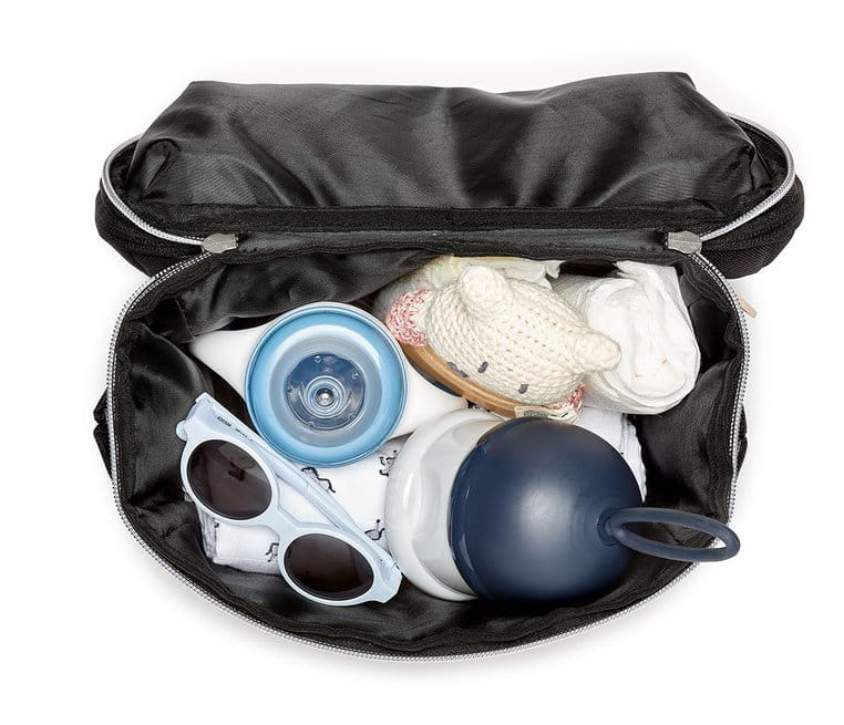 - 1 duża komora główna o pojemności 3 l, zapinana na dwustronny suwak, dzięki któremu szeroko i szybko się otwiera, ułatwia to też wkładanie i wyciąganie z niej rzeczy, np. pieluch, pojemników z pokarmem, butelki czy zabawki;
