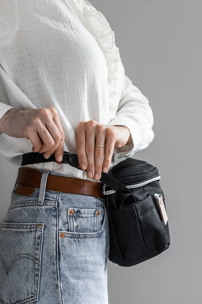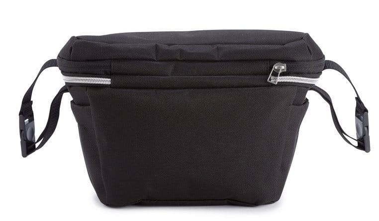 - uniwersalny, wielofunkcyjny pasek – do zamocowania na ramie wózka lub roweru, zapięcia w pasie lub przewieszenia przez ramię;