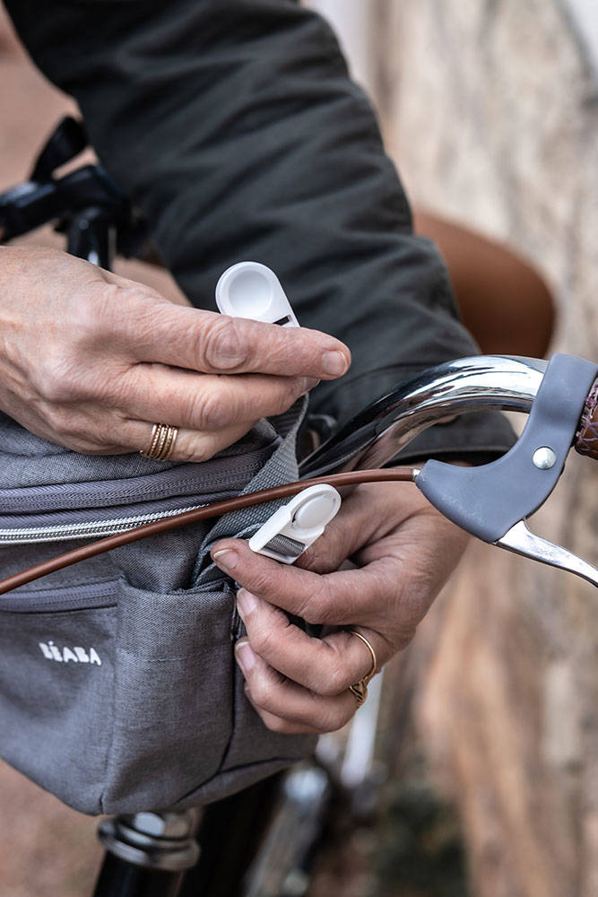 - uniwersalny, wielofunkcyjny pasek – do zamocowania na ramie wózka lub roweru, zapięcia w pasie lub przewieszenia przez ramię;