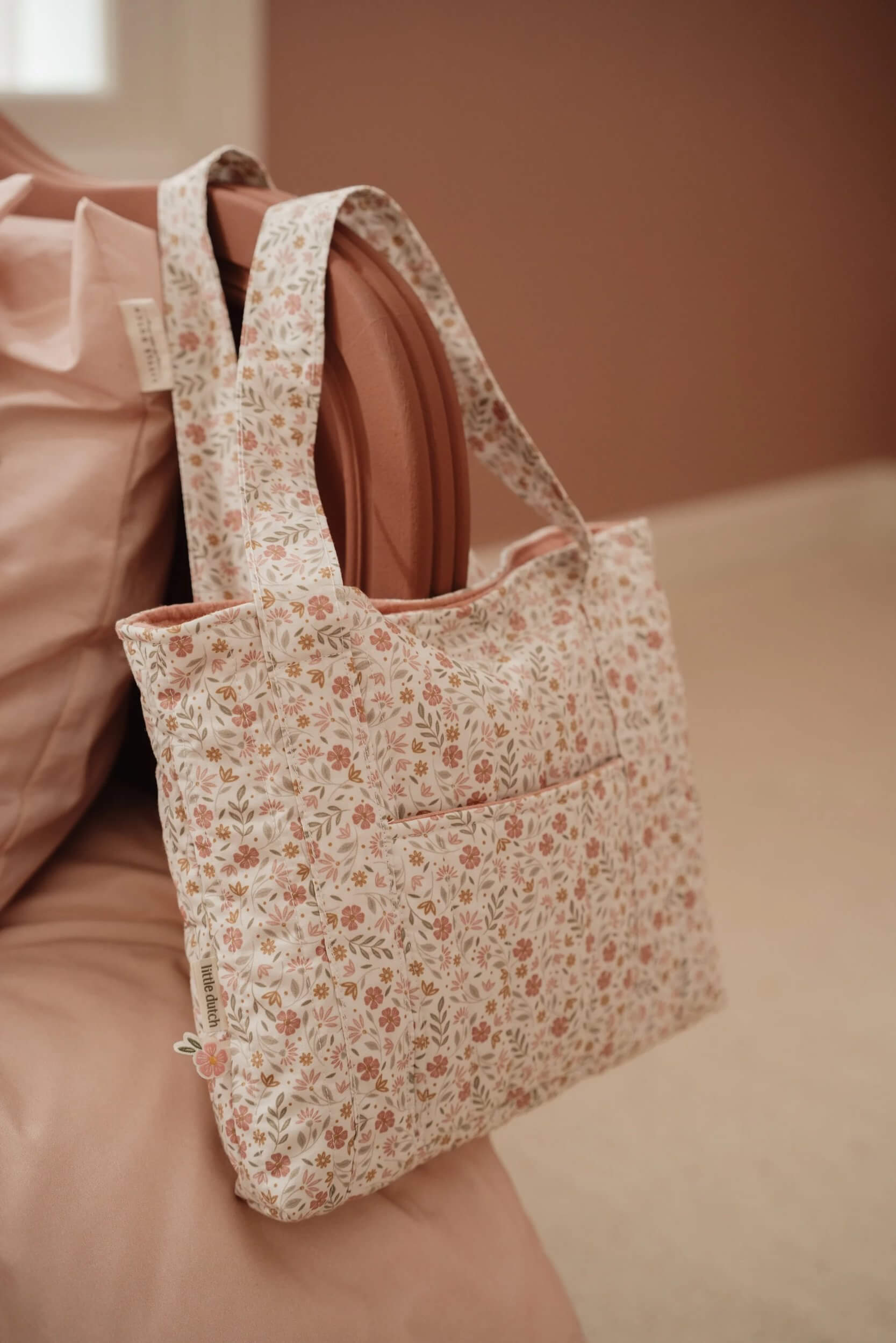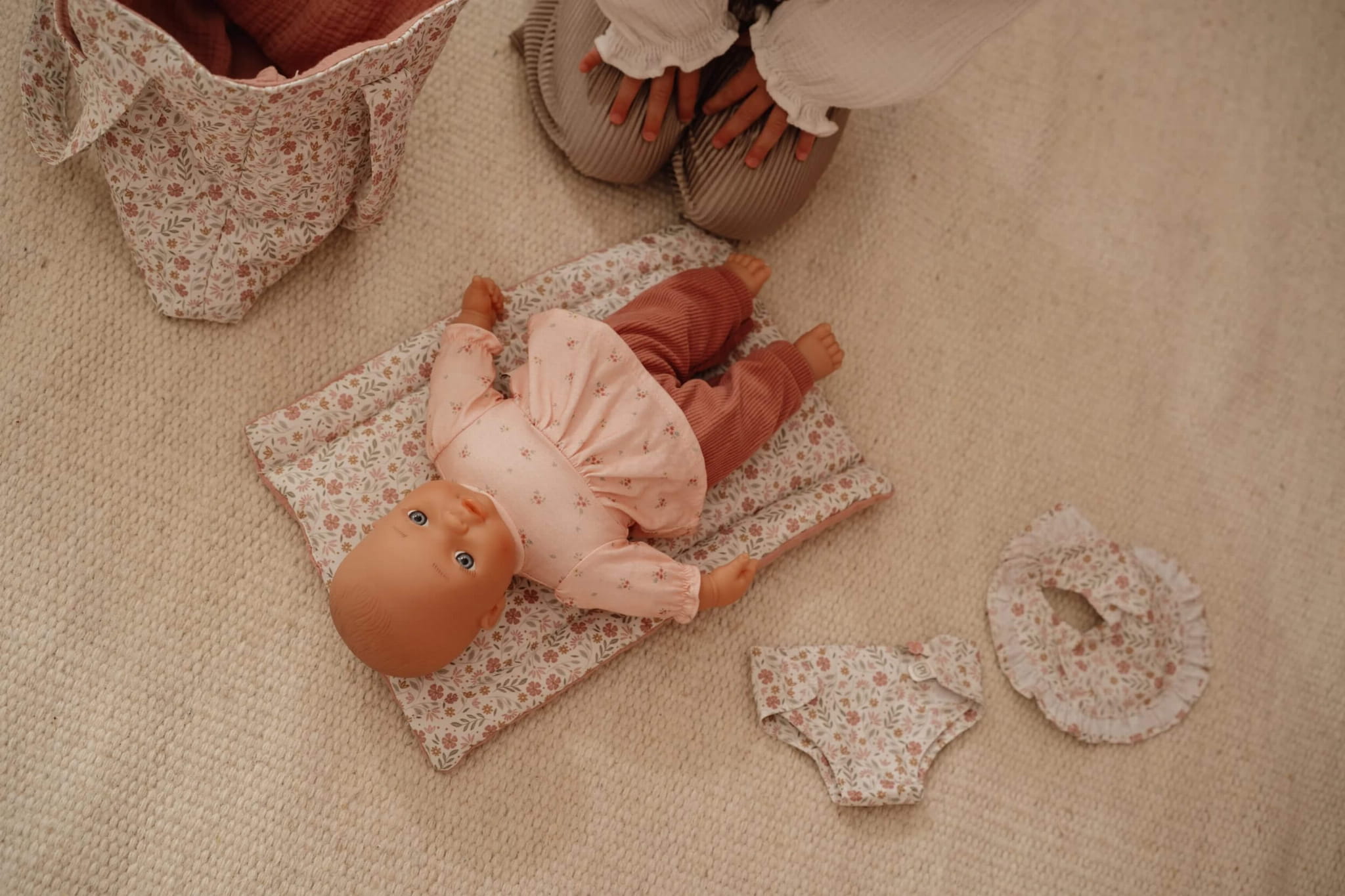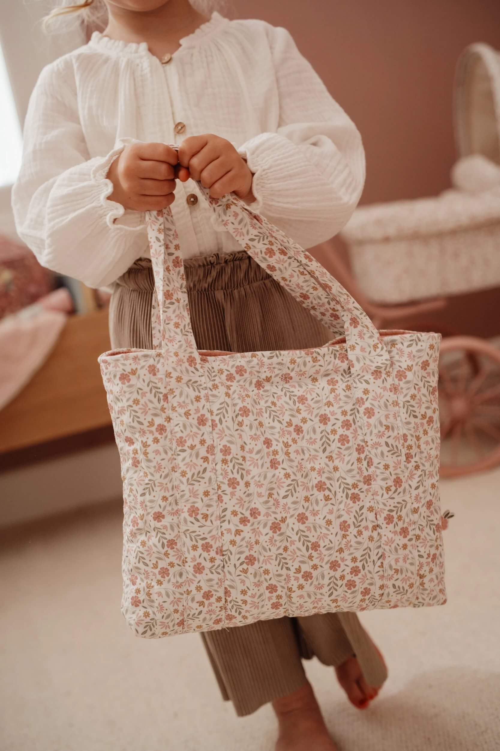 - Praktyczny zestaw akcesoriów – w komplecie znajduje się torba, przewijak, pieluszka oraz apaszka w uroczym wzorze Soft Flowers.