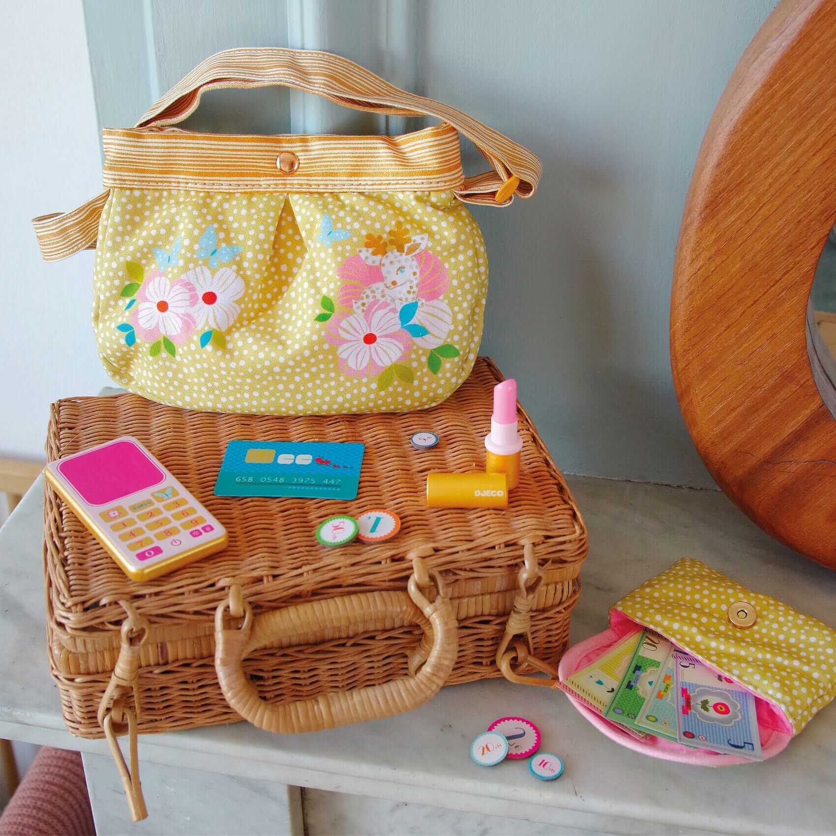 Czas wybrać się na miasto i załatwić ważne sprawy. Bawełniana torebka z regulowanym paskiem ilustrowana uroczymi motylkami zawiera wszystkie niezbędne akcesoria do wcielania się w role dorosłych: telefon, szminkę, portmonetkę, monety, banknoty i kartę kredytową. Elementy zestawu wykonane zostały z drewna posiadającego certyfikat FSC®.