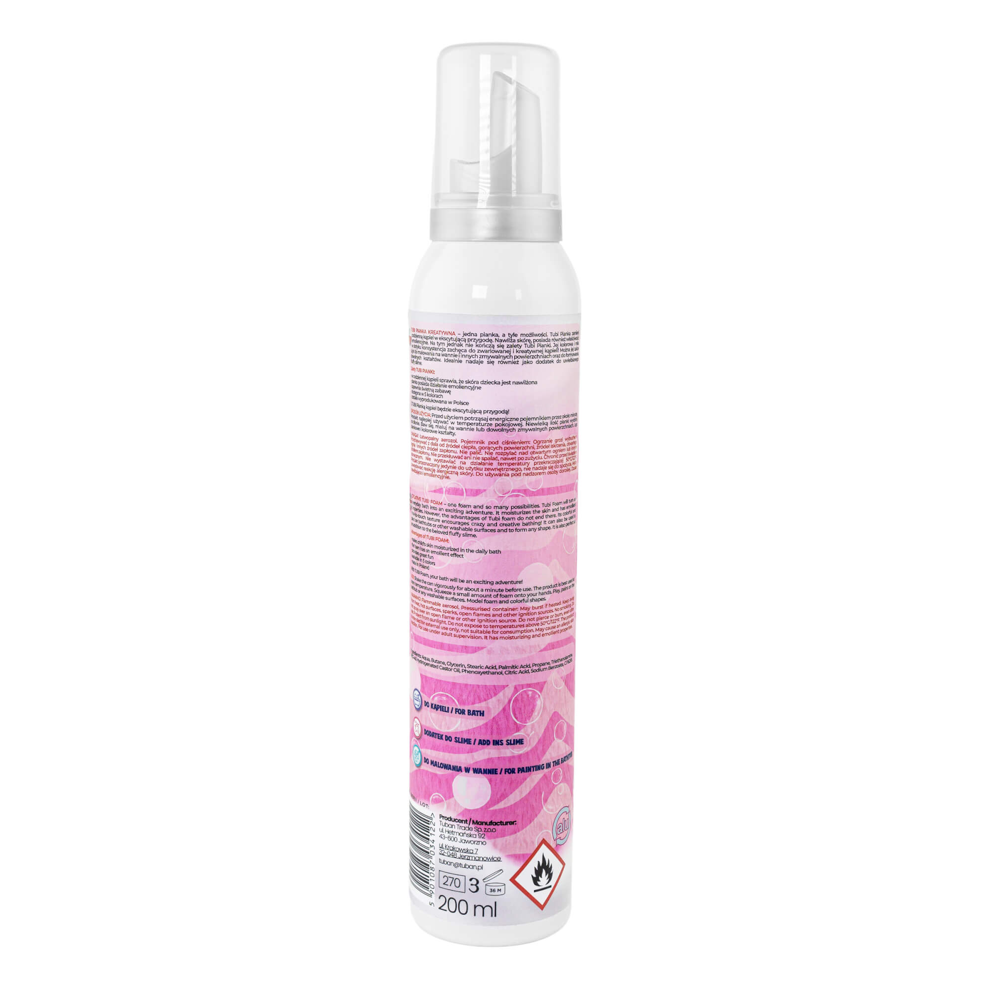 Nawilża skórę, posiada właściwości emoliencyjne i jest hipoalergiczna. Na tym jednak nie kończą się zalety Tubi Pianki. Jej kolorowa i miła w dotyku konsystencja zachęca do zwariowanej i kreatywnej kąpieli! Można jej także użyć do malowania na ciele, wannie czy innych zmywalnych powierzchniach oraz formowania dowolnych kształtów. Idealnie nadaje się również jako dodatek do uwielbianego Fluffy Slime.