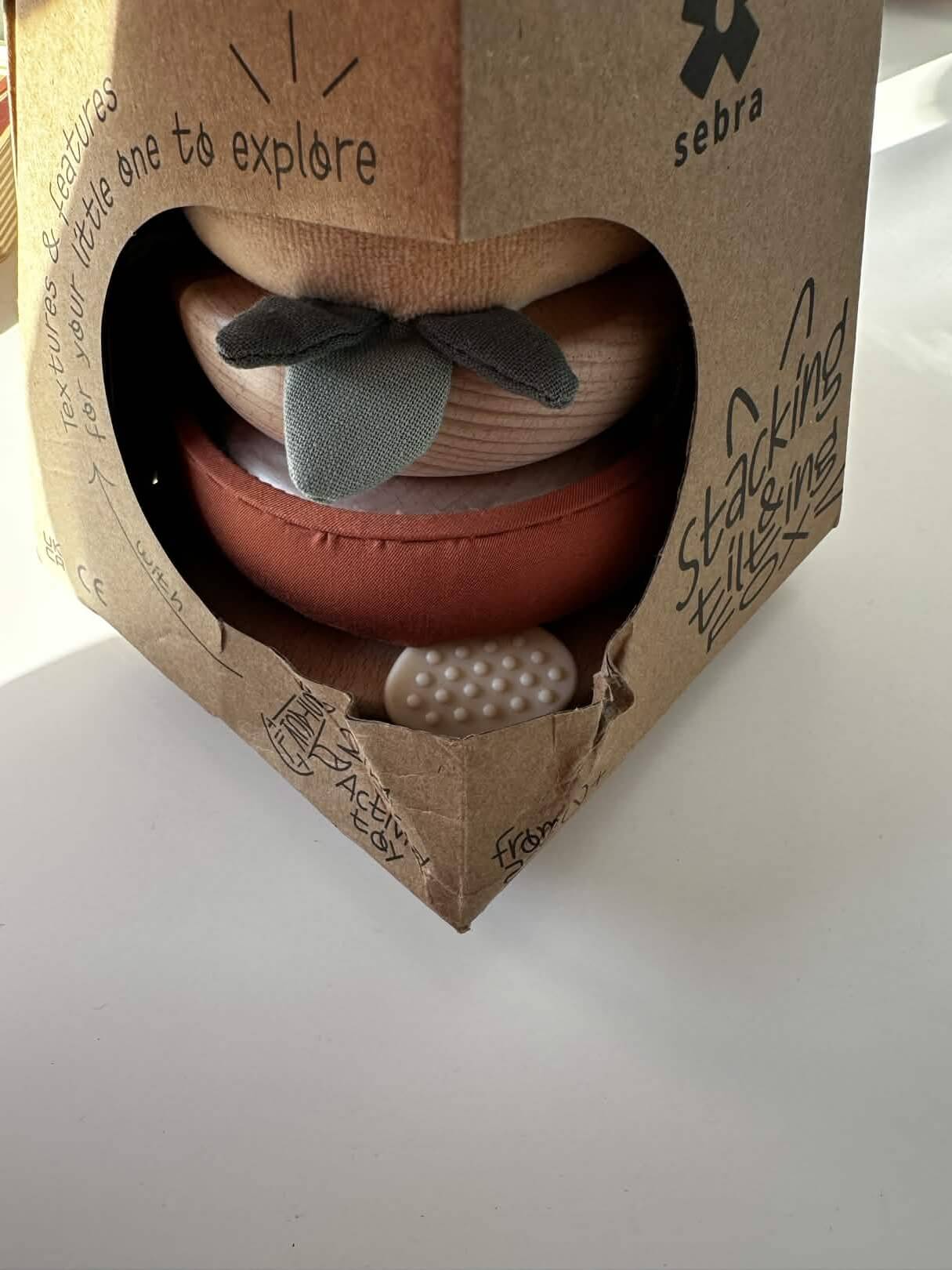 Sparky ma dwa sensoryczne elementy w kształcie stóp, bezpieczne lusterko do zabawy dla niemowląt na szczycie największego pierścienia i szeleszczący papier w ogonie lisa.