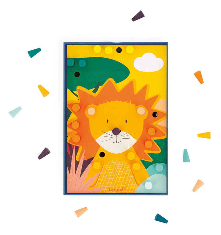 Drewniana mozaika francuskiej marki JANOD to kreatywna zabawka dla kilkulatka, który uczy się rozróżniać i dopasowywać kolory oraz trenuje chwyt i tzw. małą motorykę. Zestaw składa się z 6 plansz z grubego kartonu z wyciętymi otworami, w których należy umieszczać drewniane kołeczki w kolorze zgodnym z tłem w danym miejscu na ilustracji. Obrazki mają uniwersalne kolory i tematykę (zwierzęta, np. lis, lew, jeż, mors itp.), które przyciągną uwagę dziecka, niezależnie od płci. W komplecie są 72 kołeczki o wymiarach 1,5 cm x 0,6 cm.