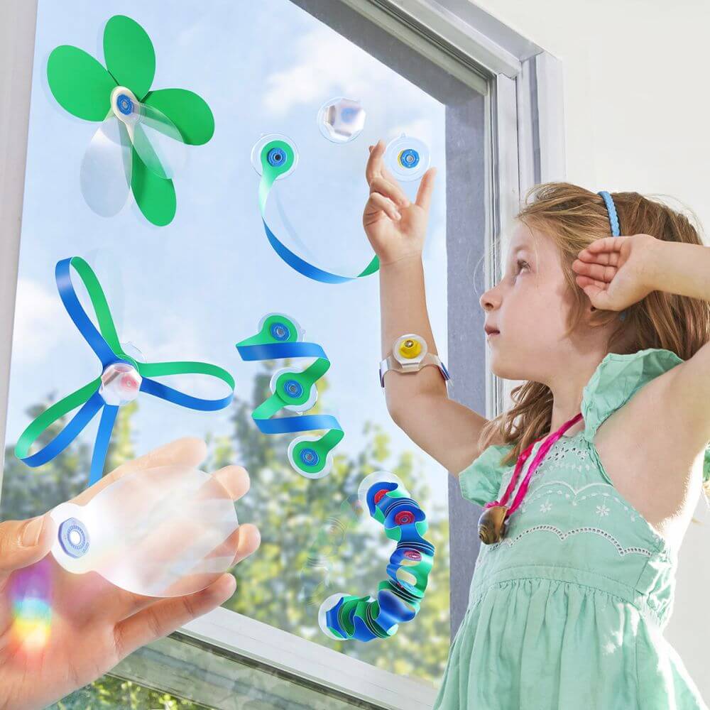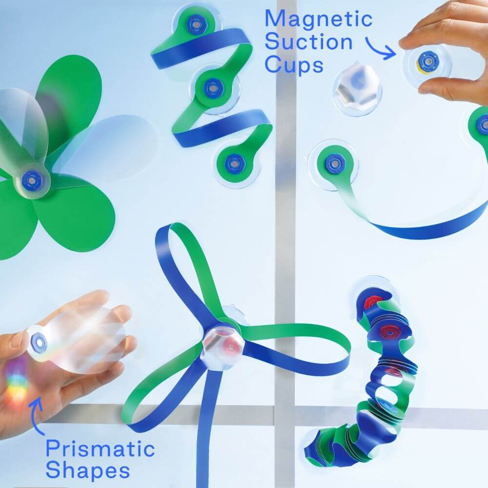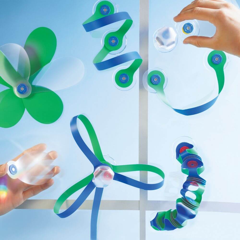 W zestawie otrzymujecie klasyczne gwiazdki z 4 ramionami, długie elementy pozwalające łączyć się samemu lub z dalszymi elementami, elementy w kształcie śmigła z jednym magnesem czy nawet magnesy punktowe z przyssawką do mocowania np. na oknie. Ponad to część elementów jest pryzmatyczna, co w połączeniu z rozproszonym światłem słonecznym sprawi, że będziecie mogli dostrzec tęczowe barwy w Waszym otoczeniu. W zestawie znajduje się instrukcja z przykładowymi kombinacjami, jakie możecie stworzyć np. wiatraczek, kulę, obręcze czy twarze.