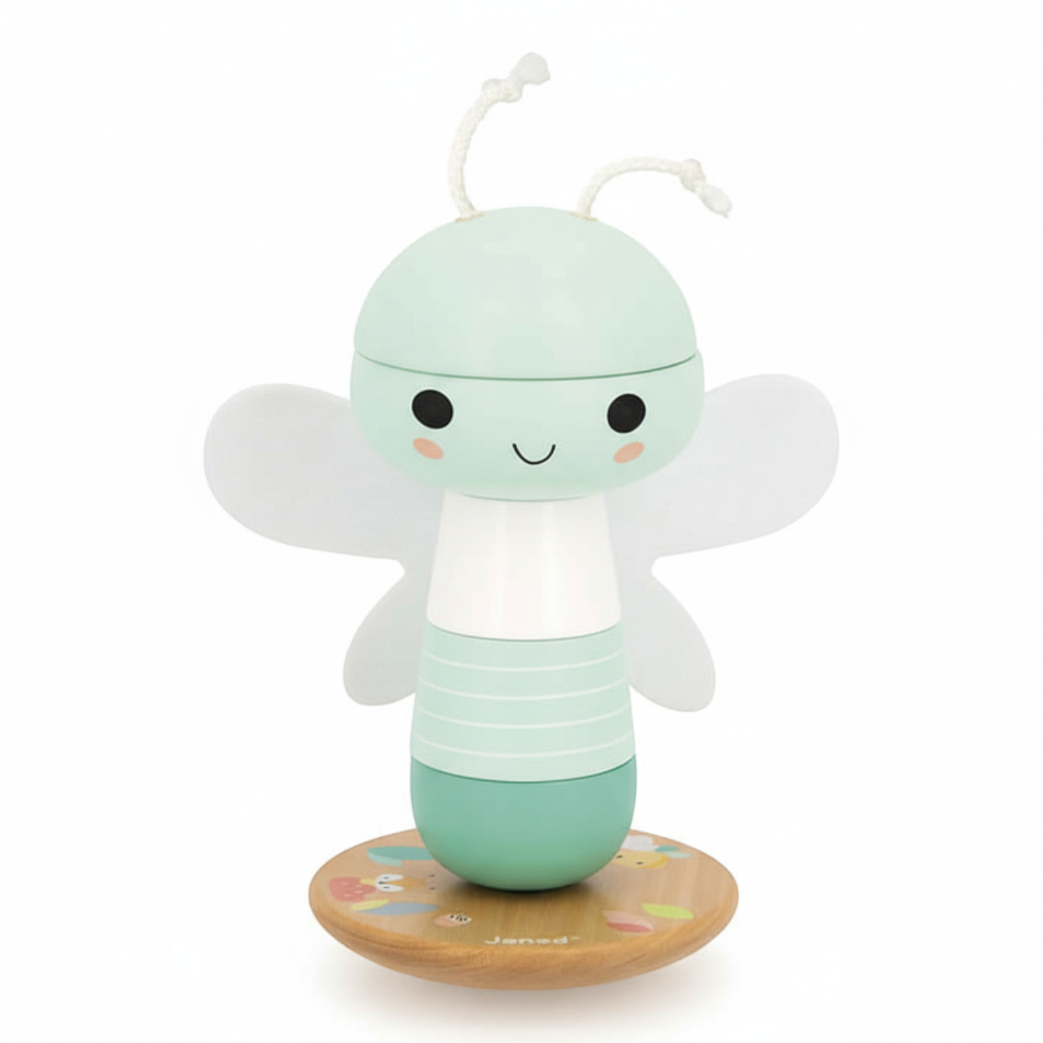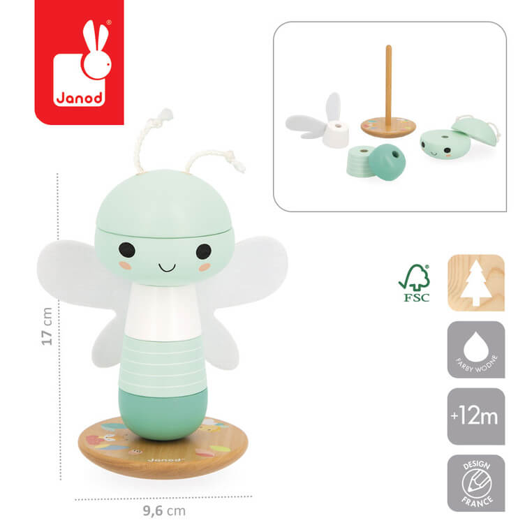 Na szerszej drewnianej podstawce znajduje się drążek, na którym należy umieszczać klocki (5 elementów) w odpowiedniej kolejności – tak, aby stworzyć uroczą miętową ważkę z filcowymi skrzydełkami i czułkami ze sznurka. Zabawka rozwija u dziecka wiele kluczowych umiejętności, m.in. chwyt i koncentrację. Zaprojektowana została we Francji. Jest zapakowana w estetyczne kartonowe pudełko. Idealnie nadaje się na prezent.