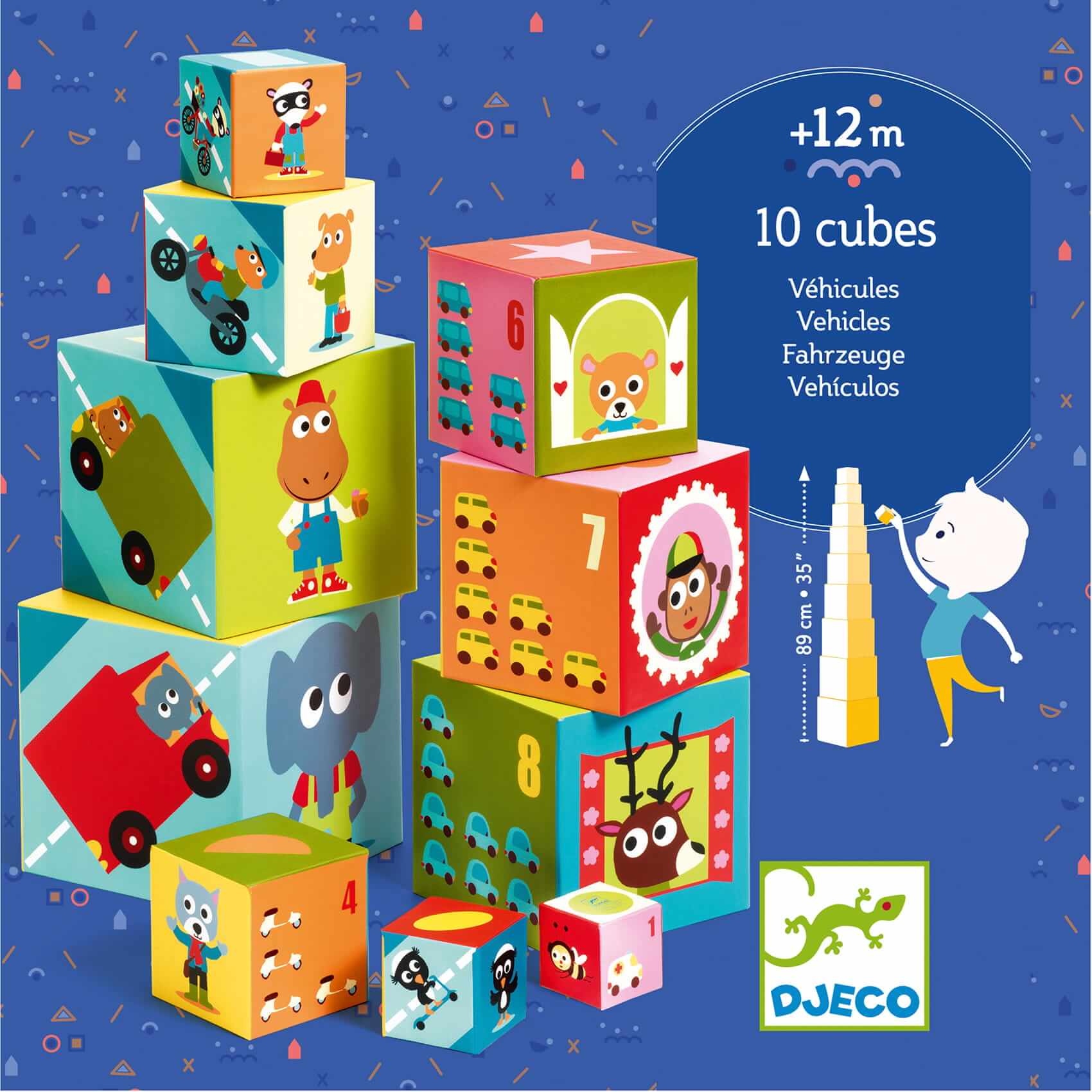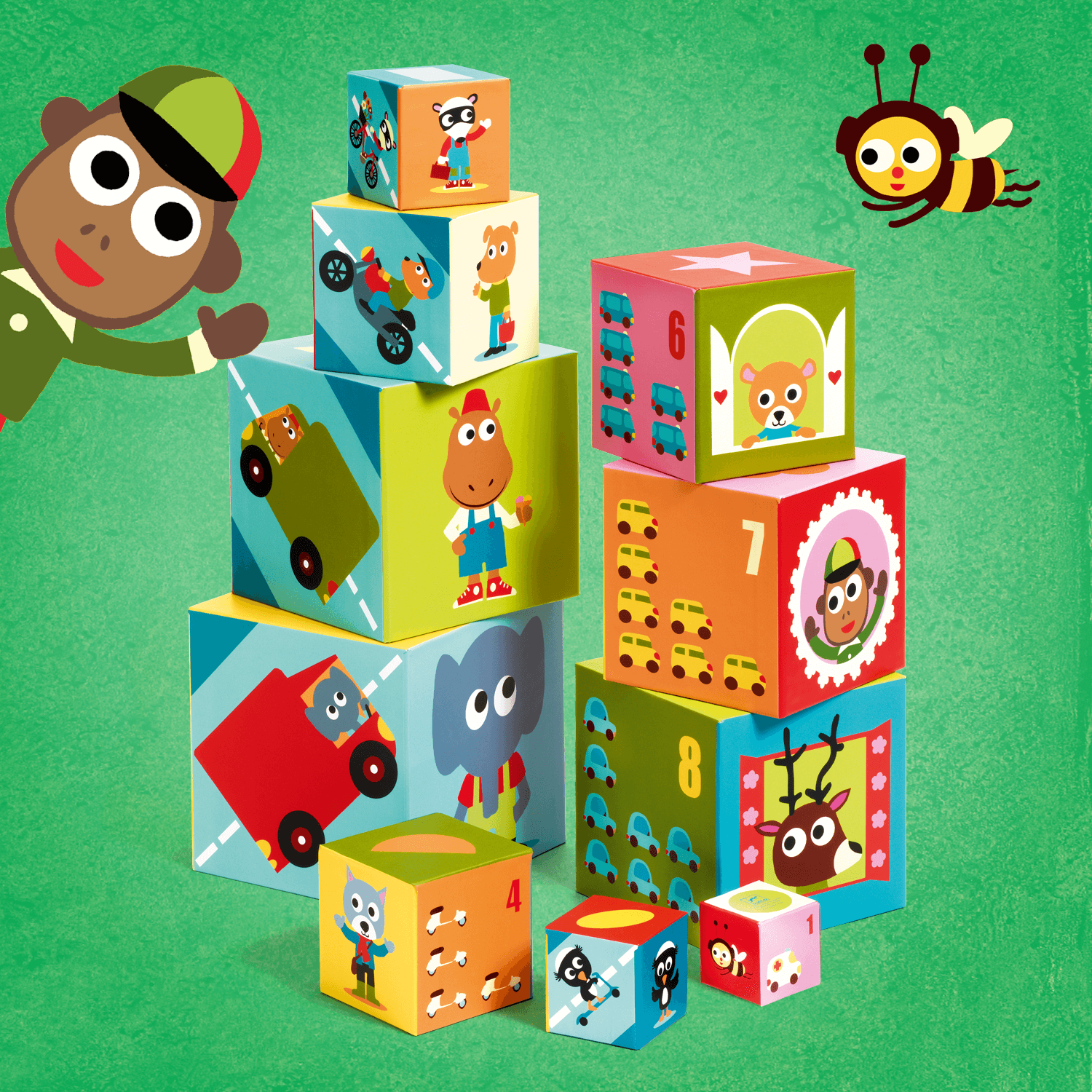 10 klocków można ułożyć w wieżę, rozwalić, powkładać jeden w drugi i tak w kółko. Dzieci układają klocki jeden na drugim tak, aby obrazki narysowane na ściankach tworzyły logiczne sekwencje. Ilustracje przedstawiają cyfry, zwierzęta i ich pojazdy oraz różne kształty w soczystych barwach. Z pozoru proste kartonowe klocki będą źródłem kreatywnej i rozwijającej zabawy. Klocki ułożone na sobie tworzą piramidę o wysokości aż 86 cm! Idealny sposób na wspólne spędzenie czasu i naukę zwierzątek, cyfr lub kolorów. Wykonane są z trwałego i grubego kartonu posiadającego certyfikat FSC®.