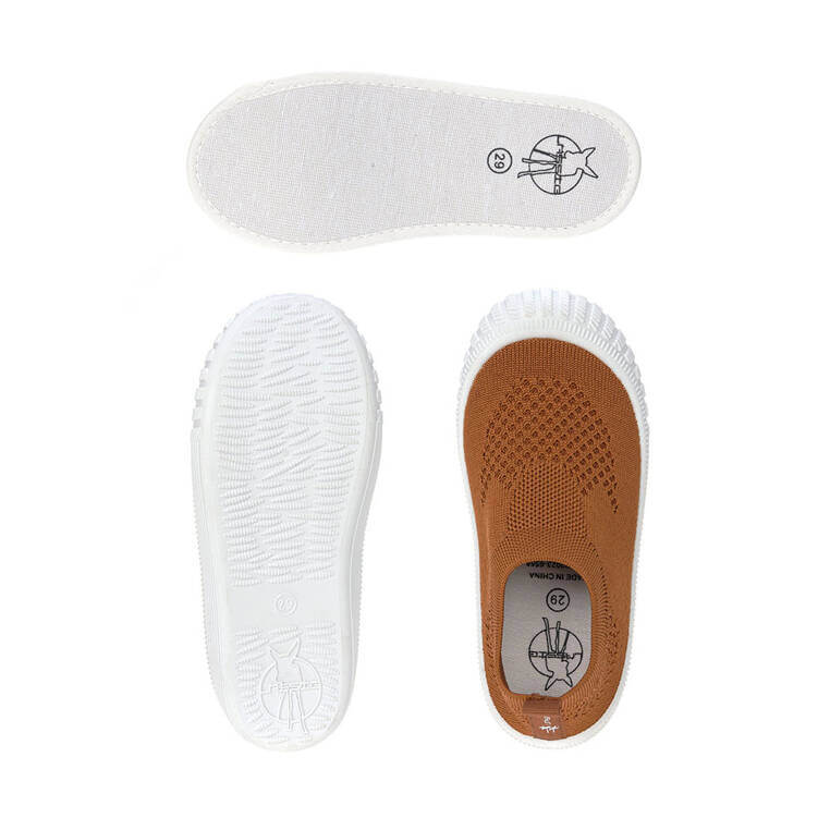 Wykonane są z miękkiej, przyjemnej do noszenia i szybkoschnącej perforowanej tkaniny w kolorze karmelowym. Oddychające, rozciągliwe, wkładane jak skarpetka, z profilowaną, giętką i antypoślizgową podeszwą z kauczuku. Ta mieszanka nie tylko sprawia, że sneakersy są cudownie lekkie i elastyczne, ale także wspomagają naturalny ruch toczony dziecięcych stóp. Idealne dla małych biegaczy i odkrywców świata! Także podczas zabaw nad wodą!