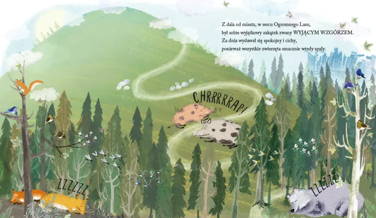 Najpierw próbują go odstraszyć wilki, potem podejmują się tego zadania niedźwiedzie, dziki i lisy. Ale bez rezultatu. Mądre sowy proponują więc wysłanie najmniejszych stworzeń. Czy potężna chmura pszczół, much i ważek sprawi, że Wielkie Niebieskie Coś opuści wzgórze i na nowo zapanuje tam upragniony spokój? Przekonajcie się, jak wielka jest determinacja zwierząt w walce o swoje wzgórze i czym jest tajemnicze Wielkie Niebieskie Coś.