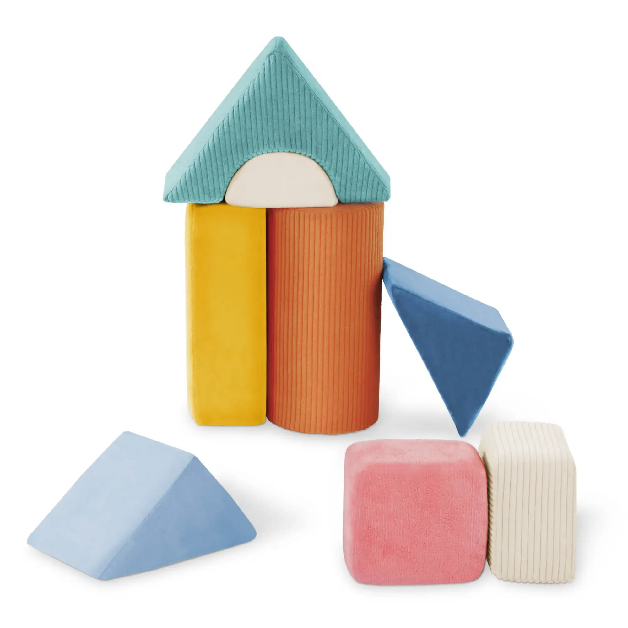 Tumble-y Towers to nie tylko zwykła zabawka, to starannie zaprojektowany zestaw 8 zróżnicowanych brył (walec, łuk, kliny, prostopadłościany), które idealnie do siebie pasują, umożliwiając tworzenie stabilnych, a zarazem miękkich budowli. Elementy są wypełnione sprężystą, tapicerską gąbką i obszyte wysokogatunkową, sensorycznie zróżnicowaną tkaniną, co sprawia, że są niezwykle przyjemne w dotyku i zachęcają do eksploracji. Mimo swojej miękkości, klocki są na tyle wytrzymałe, że pozwalają na wznoszenie imponujących konstrukcji, które nie tracą stabilności.