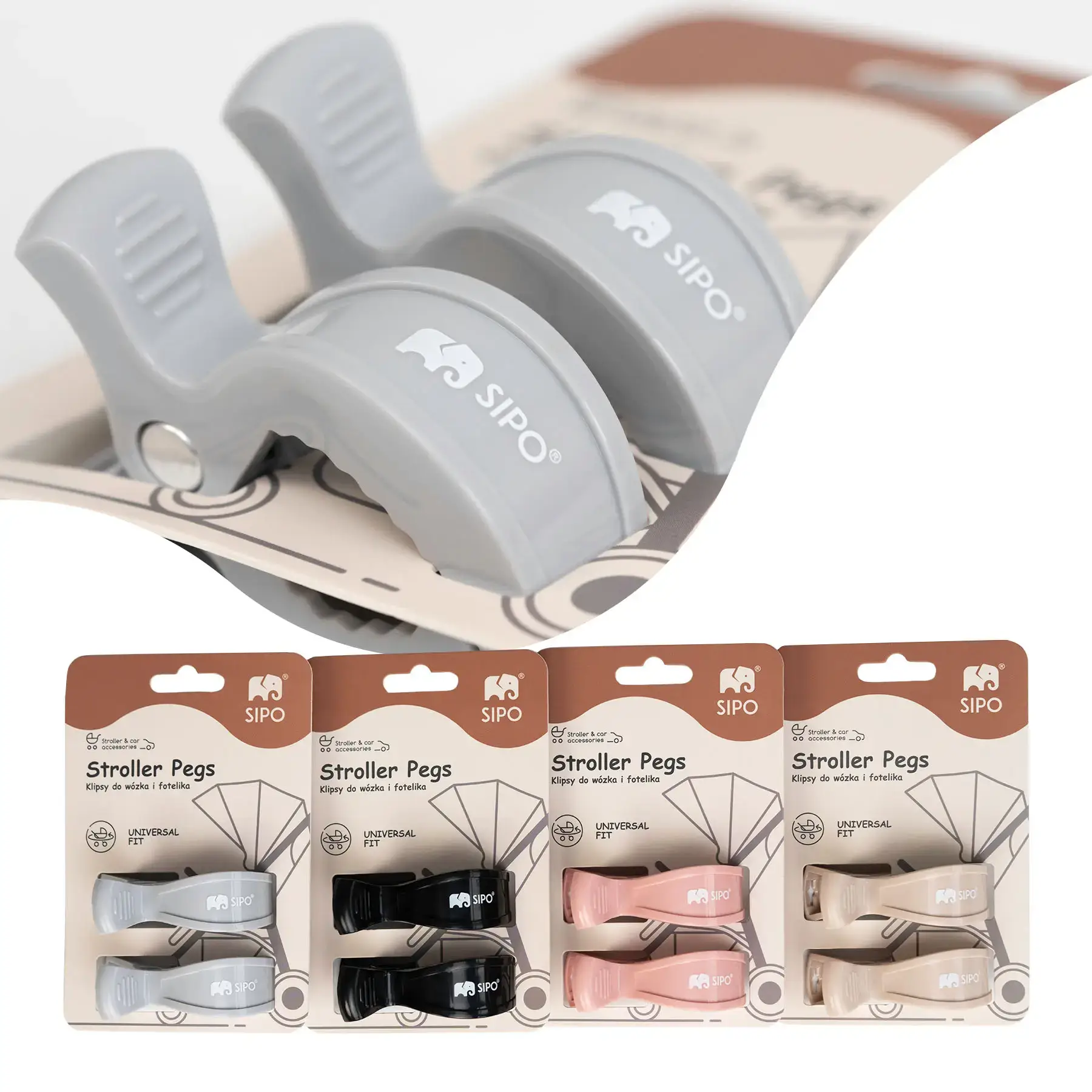 Wielofunkcyjne zaczepy do wózka SIPO wykonane są z trwałego i odpornego tworzywa ABS, są łatwe w obsłudze, a ich uniwersalny kolor sprawia, że pasują do każdego wózka. Zestaw zawiera 2 sztuki klipsów do wózka – wystarczająco, by przypiąć najważniejsze akcesoria dziecka.