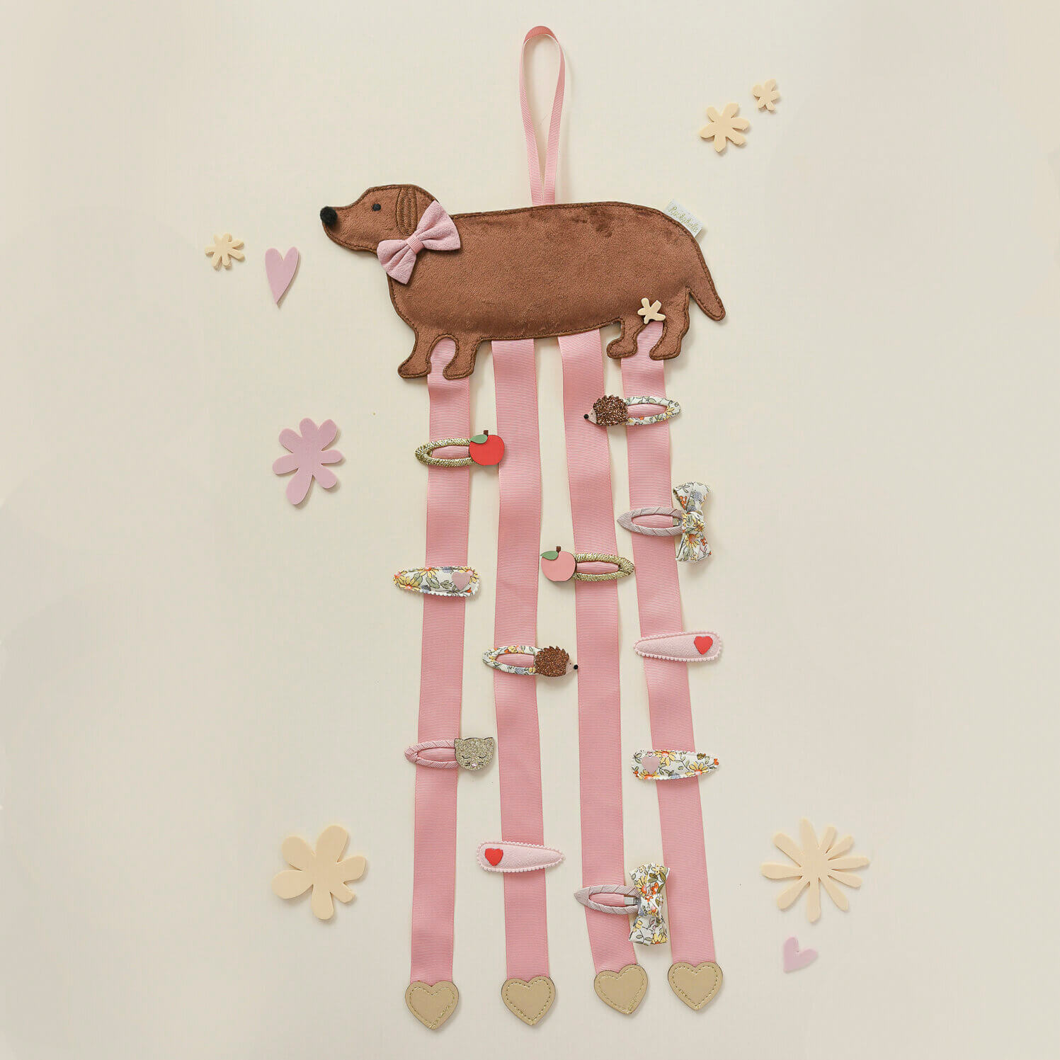 Morris jamnik – wieszak na spinki – wykonany jest z super miękkiego weluru i ma uroczą buźkę oraz muszkę! Dzięki czterem paskom do zawieszania pomieści około 52 spinki (w zależności od ich rozmiaru), a dodatkowo oferuje miejsce do przechowywania – Morris to także ukryta kieszonka!