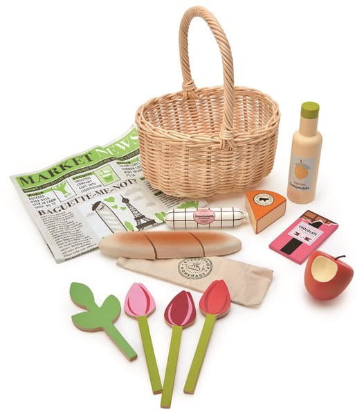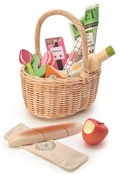 Wybierz się na piknik z plecionym koszykiem z akcesoriami! W koszyku znajdziesz - bagietkę w materiałowej torebce (bagietka jest w 3 częściach na rzepy), salami, kawałek sera, lemoniadę w butelce, tabliczkę czekolady, jabłko, gazetę oraz kwiatki.