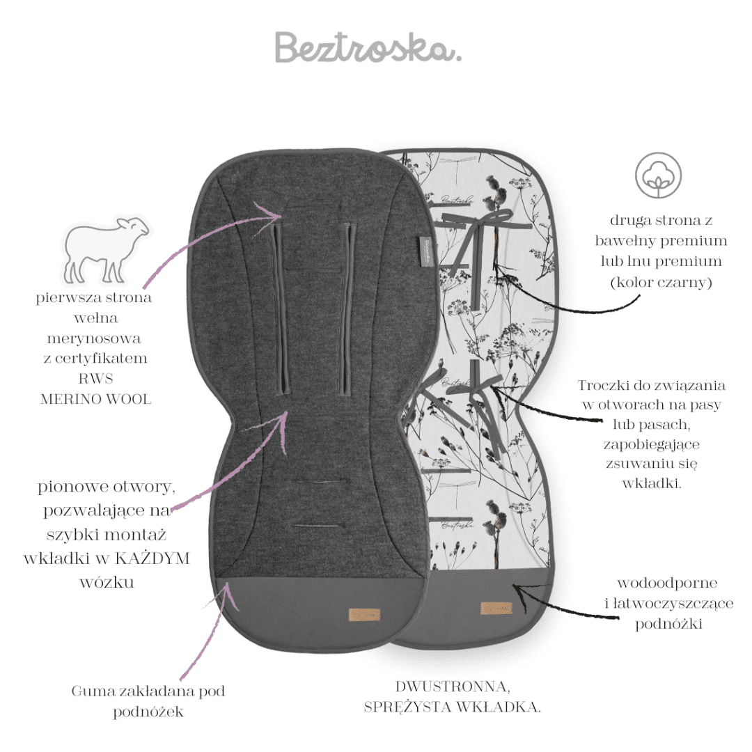 "I jak Wam się podoba taka propozycja? My czujemy, że to będzie hit! Cieszymy się tym bardziej, bo poszukiwania idealnej wełny merynosowej zajęły nam ponad rok. Wiecie że my albo coś robimy na 100% albo wcale. Dlatego teraz jesteśmy gotowe do przedstawienia Wam naszej kolekcji z wełną merynosową. Zapewne w Waszej głowie pojawi się pytanie- czy mogę zamówić wkładkę z merino dedykowaną do mojego modelu wózka? Odpowiedź godna Beztroski mogła być tylko jedna: kliknij tutaj i zamów wkładkę do swojego modelu. A jeśli jakaś siła szepnie Wam do ucha pytanie- a co z poduszką, czy poduszkę również mogę zamówić w wersji wełnianej? Znacie nas…"