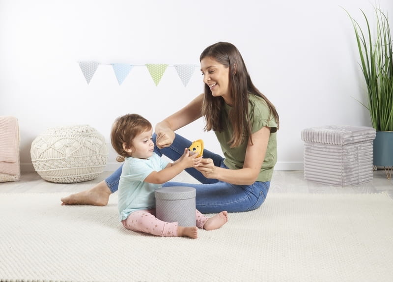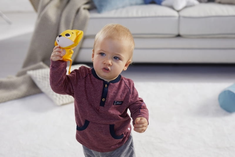 - Schowaj Leonarda, na przykład pod kocem, a ten zacznie nawoływać dziecko do znalezienia go. Najlepiej chować zabawkę za każdym razem w innym miejscu (w pudełku, szufladzie, albo gdziekolwiek indziej), urozmaicając w ten sposób zabawę
