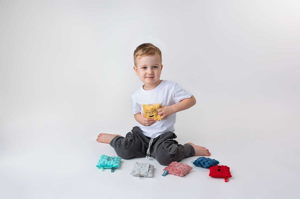W pudełku znajduje się 6 woreczków różniących się emocją, kolorem oraz wypełnieniem. Mają one naturalne wkłady: grykę z lawendą, groch, ryż, kaszę jaglaną, siemię lniane oraz pestkę wiśni.