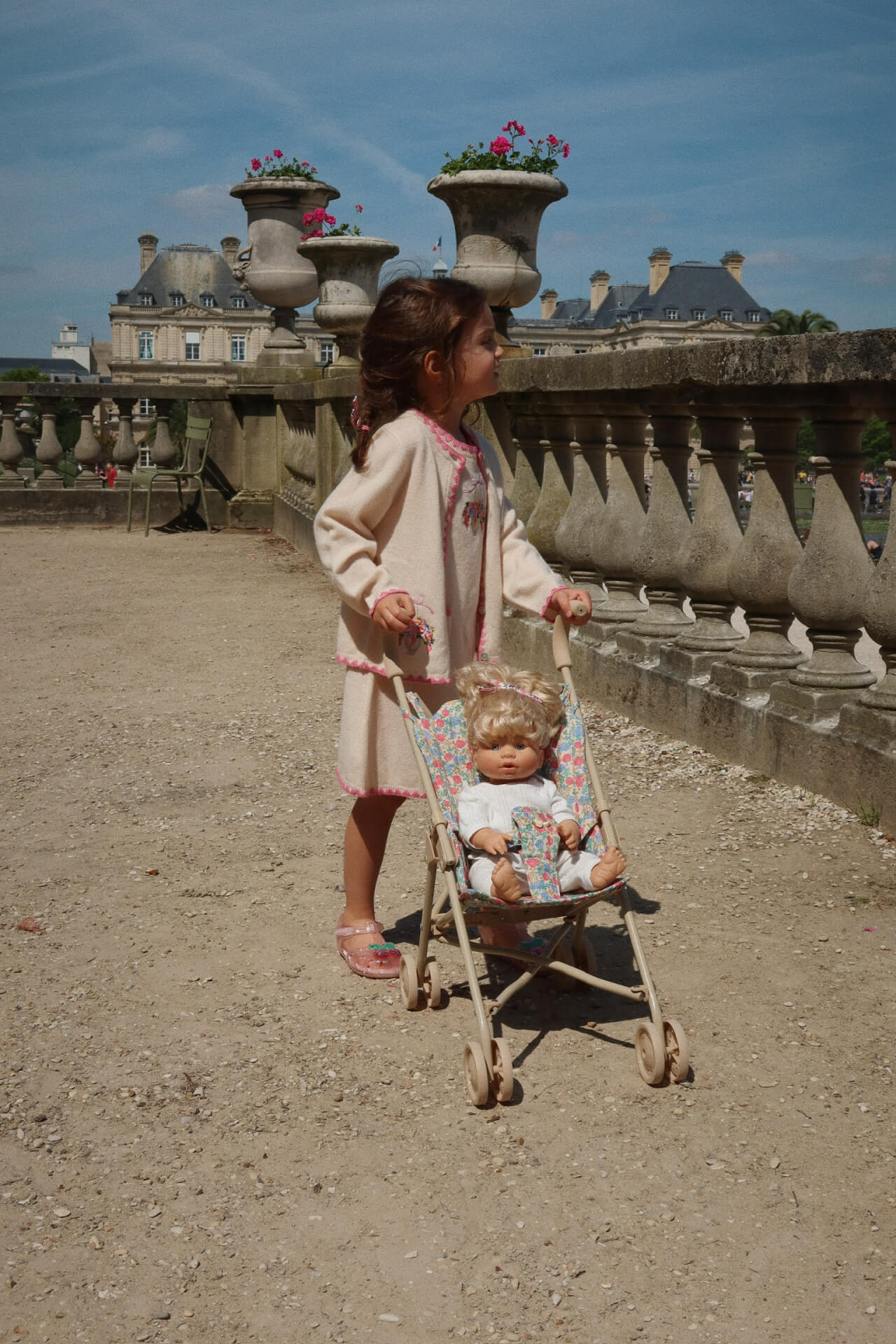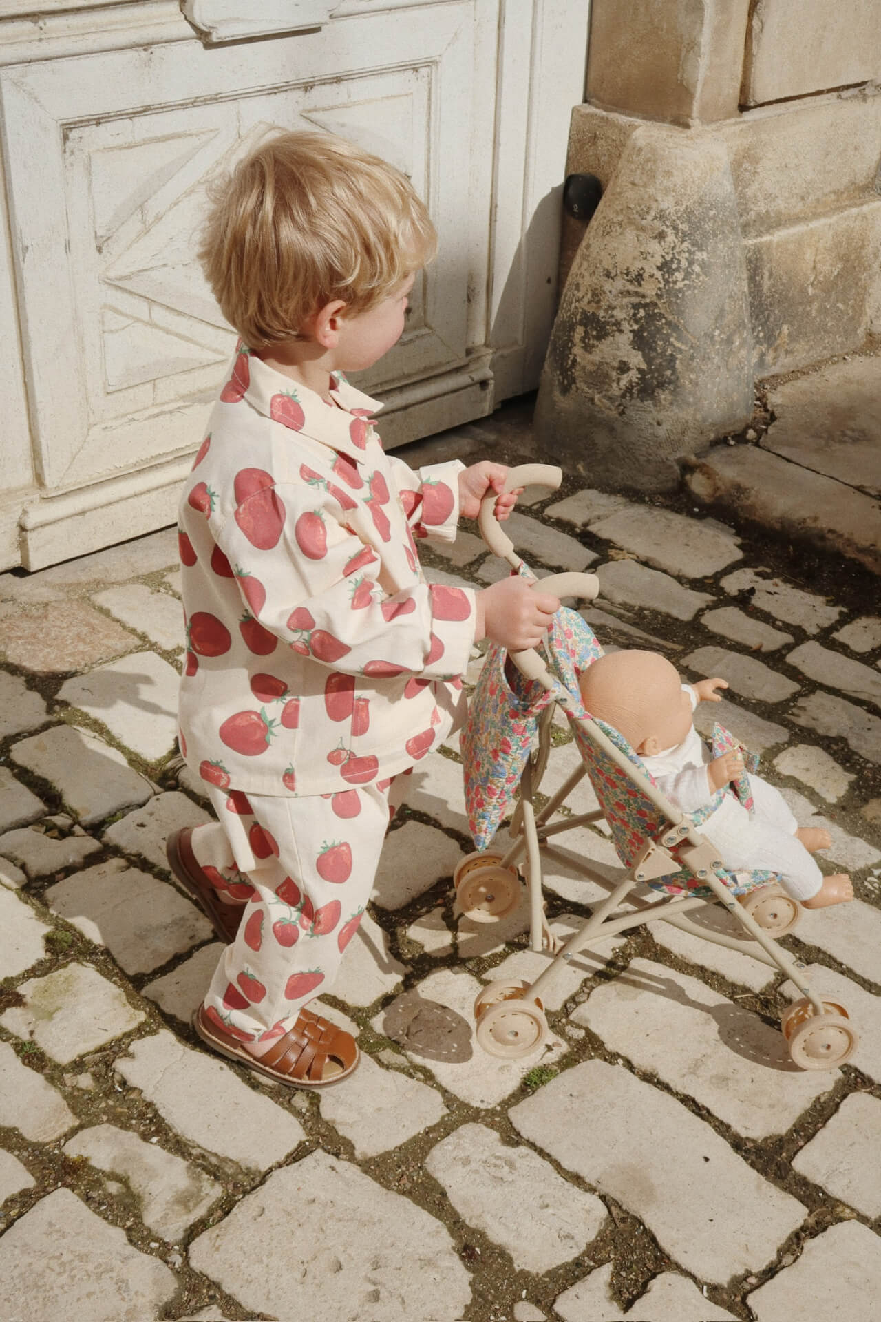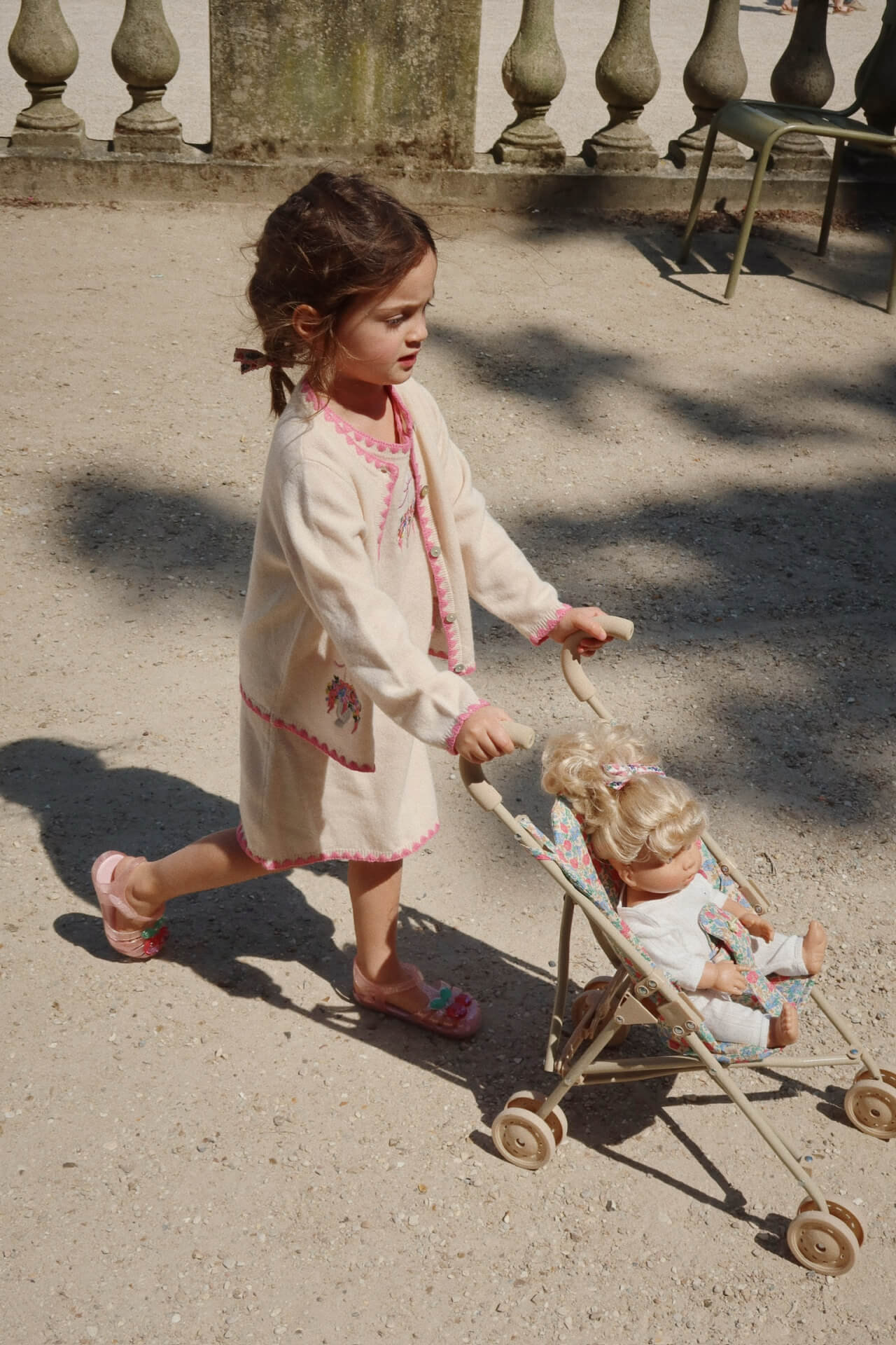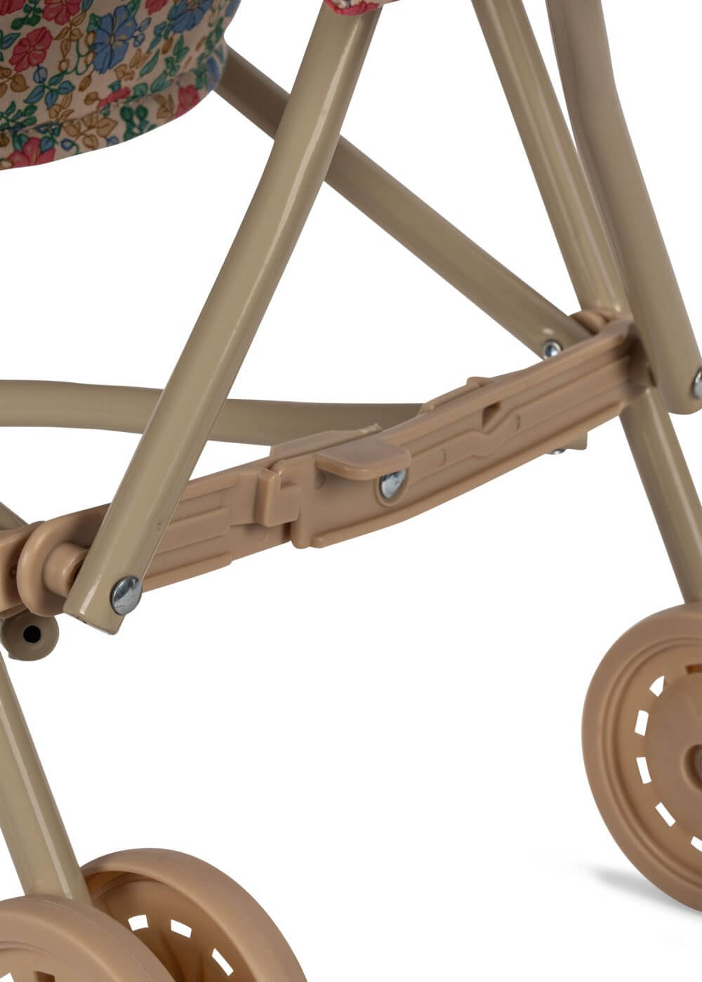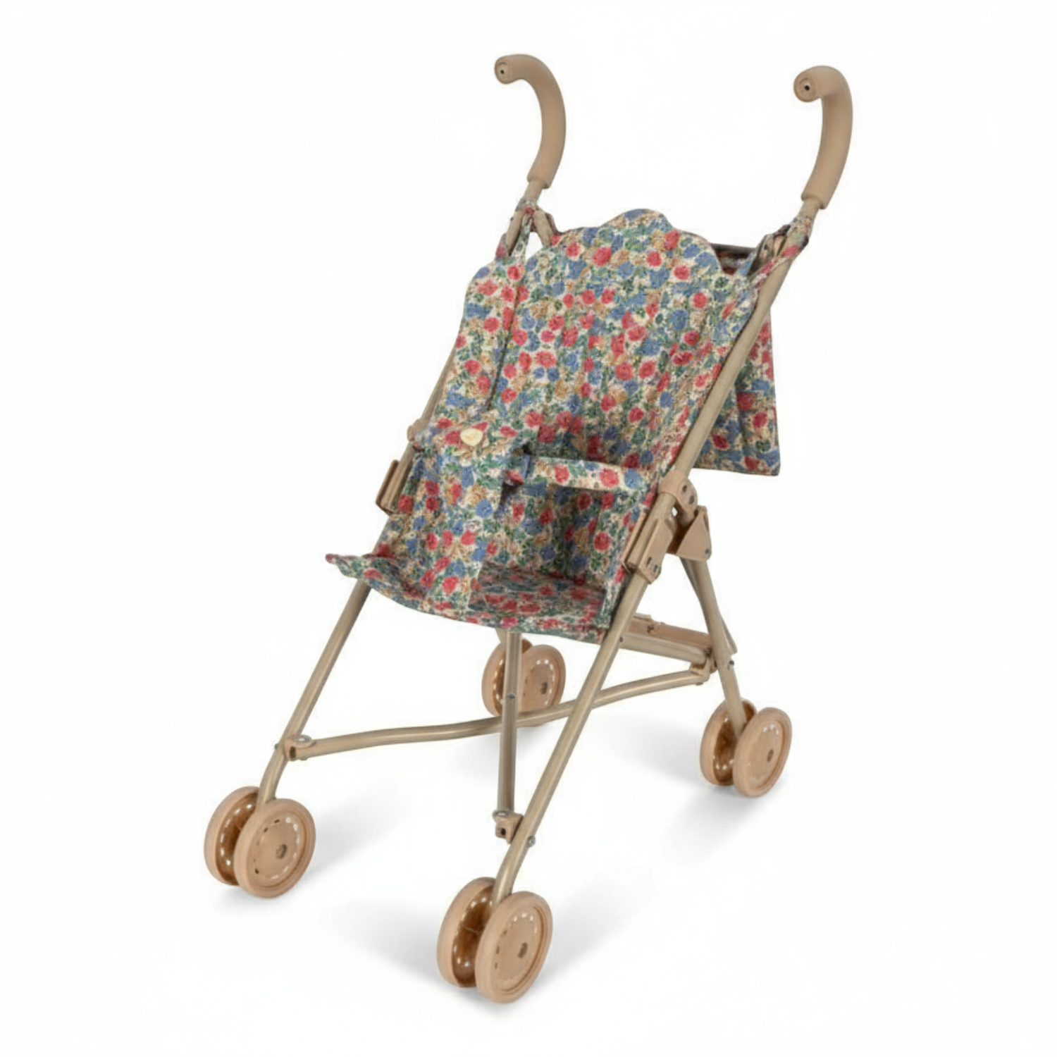Wózek dla lalek zaprojektowany z uprzężą, torbą transportową i podwójnymi kołami na wszystkich czterech nogach dla dodatkowej stabilności