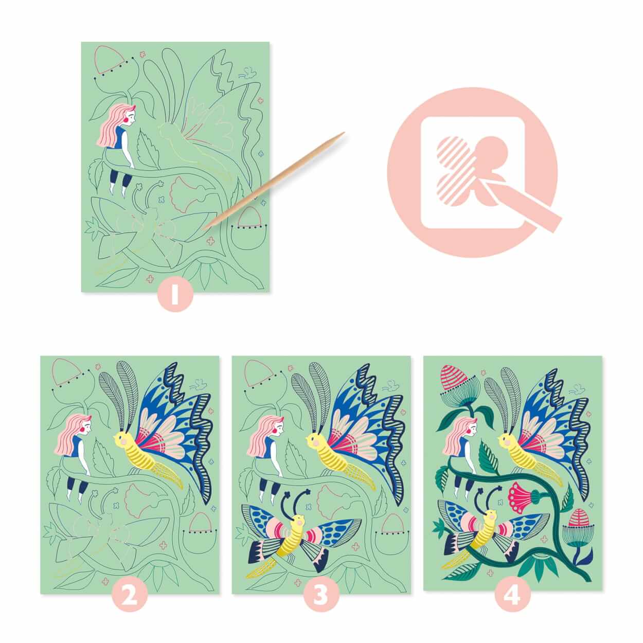 Załączonym rysikiem należy zdrapywać według instrukcji kolejne fragmenty ilustracji a otrzymamy 4 piękne obrazki