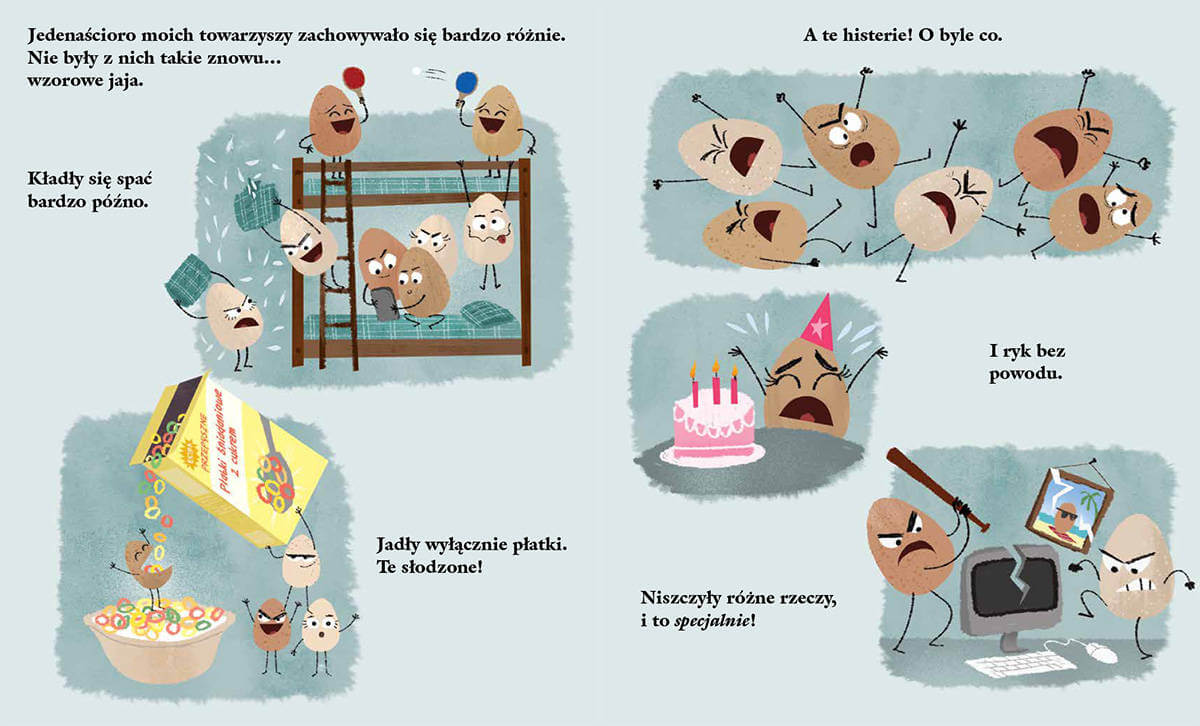 Bohater książki dla dzieci "Wzorowe Jajo" z serii Smaczna Banda i emocje pomoże każdemu i o każdej porze – pomaluje dom, zmieni opony, zaniesie do domu zakupy i zdejmie z drzewa przerażonego kotka. Przysługi to jego specjalność, a uczynność – drugie imię. Jajo pamięta o wszystkich poza… nim samym i łatwo przewidzieć, czym to się może skończyć. Ale…czy można być dobrym jednocześnie dla siebie i dla innych? Ta mądra, pozytywna, a przy tym zabawna i wielopoziomowa opowieść to sposób na to, by w przystępny i bezpośredni sposób zaprosić dziecko do rozmowy o emocjach, uczuciach, życiowych priorytetach, stawianiu granic, a wreszcie - o szczęściu.