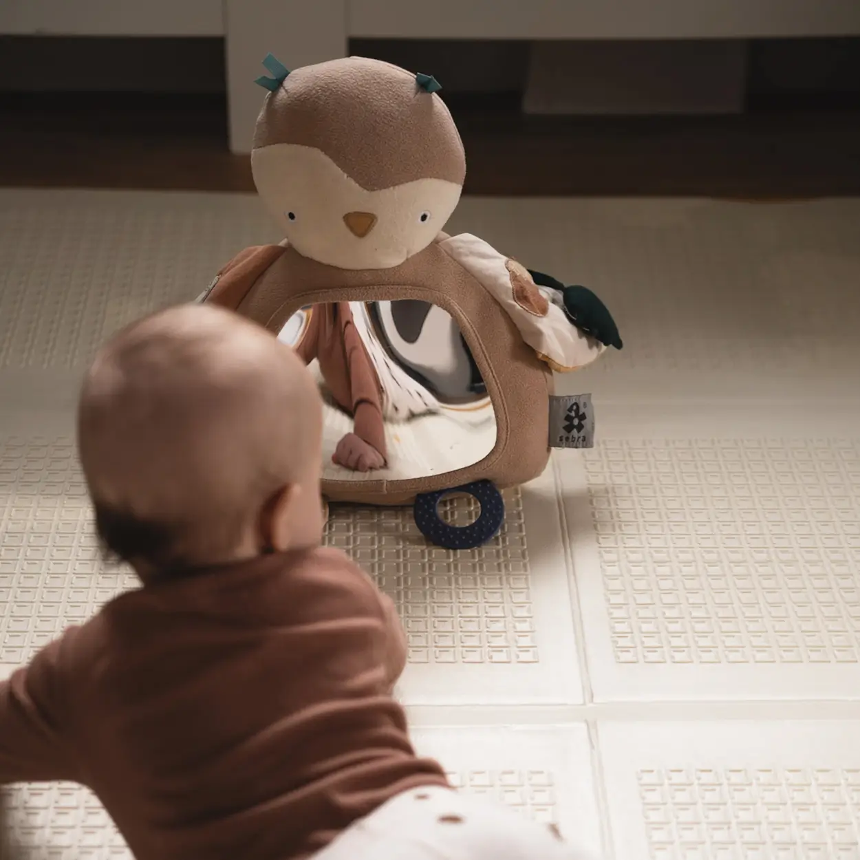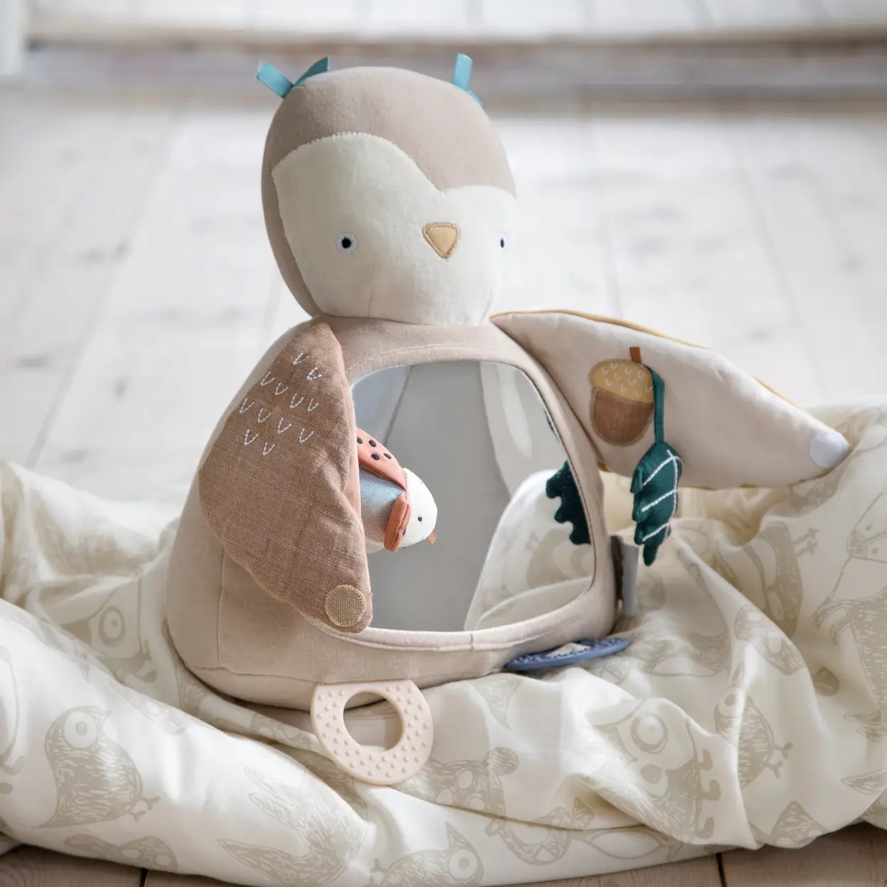 Urocza zabawka aktywna w kształcie sowy Blinky z dużym, bezpiecznym dla dziecka lusterkiem, gryzakami i elementami, które można badać i odkrywać
