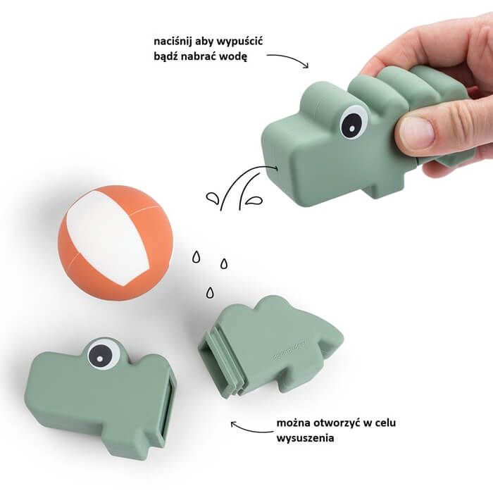 Wystarczy ścisnąć krokodyla, aby napełnić go wodą i nacisnąć, aby pryskał wodą, dzięki czemu kąpiel staje się zarówno zabawna, jak i interaktywna.