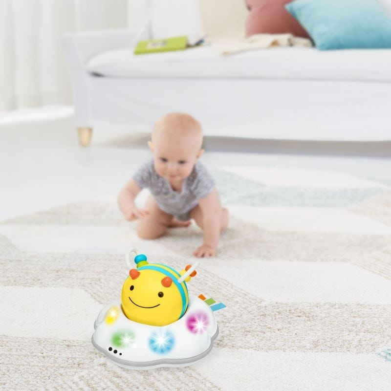 Jeżeli szukasz zabawki, która pomoże Ci zachęcić dziecko do raczkowania, to z pewnością nie będziesz zawiedziona naszą pszczółką z serii explore&more! Zaprojektowana by rosnąć razem z dzieckiem poprzez 3 etapy. Pierwszy etap zabawy (dla dzieci, które jeszcze nie raczkują) polega na zabawie pszczółką-grzechotką, która zabawnie kołysze się i nie upada. Na drugim etapie zabawy (dla dzieci, które zaczynają raczkować) pszczółka jeździ dookoła w swojej chmurce. Kiedy dziecko wyciągnie pszczółkę, pojazd zaczyna kręcić się wokół własnej osi. Trzeci etap (dla dzieci, które swobodnie raczkują) polega na tym, że pojazd pszczółki, w przeciwieństwie do drugiego etapu, nie porusza się już według określonego schematu. Ucieka przed maluchem w różnych kierunkach. Żywiołowa zabawa gwarantowana! Pojazd pszczółki unika przeszkód dzięki wbudowanym czujnikom. Nasza zmotoryzowana pszczółka rzuca wyzwanie i zachęca wszystkie maluchy to tego, by uczyły się podążać na czworaka za kolorowymi światełkami, energetycznymi dźwiękami i słodkimi odgłosami bzyczenia.