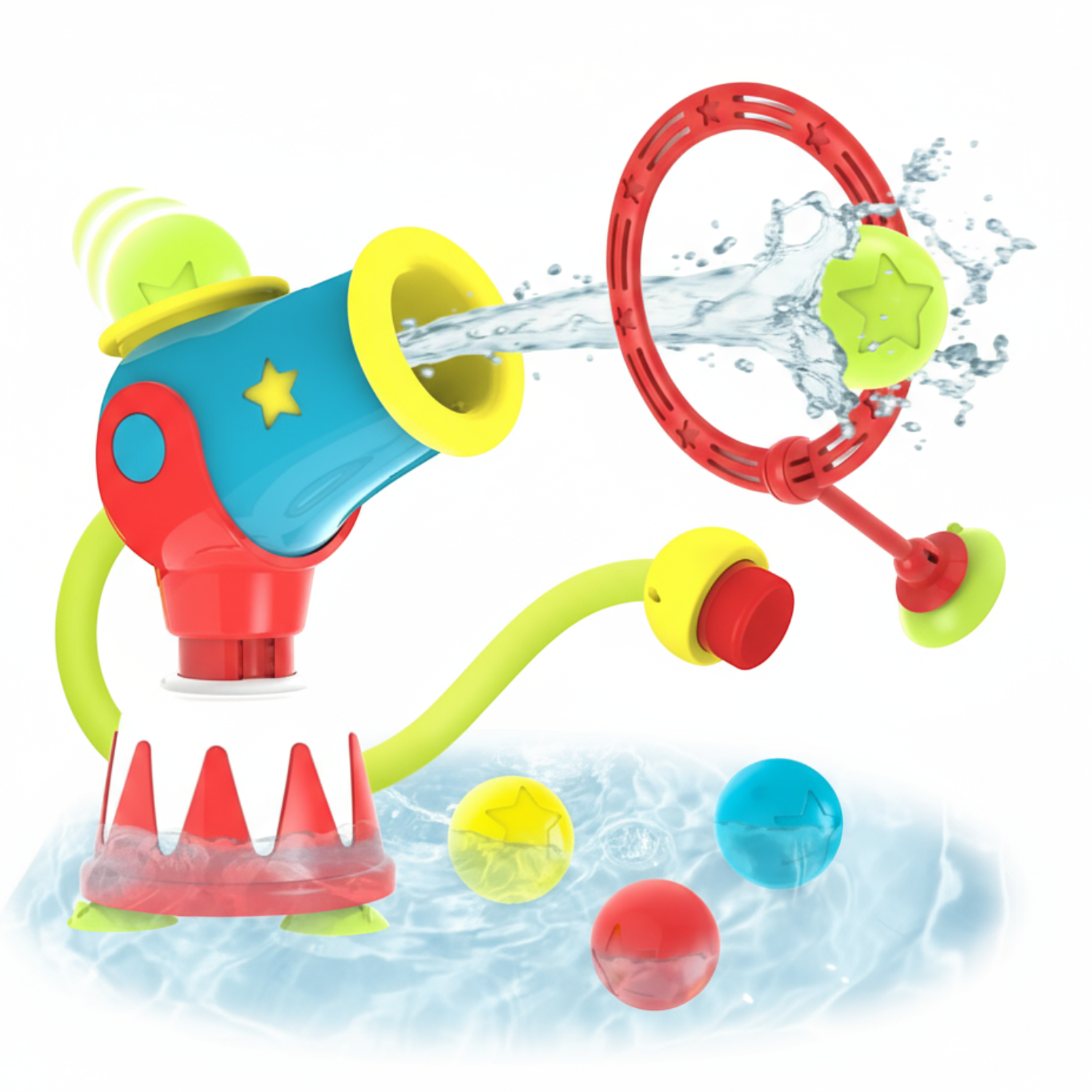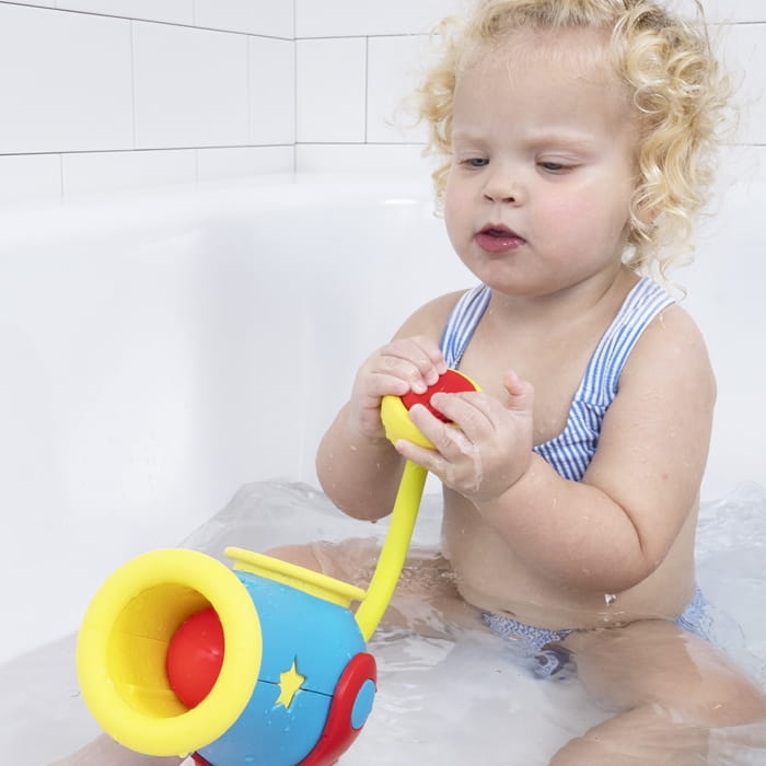 Kolorowa armatka wodna przychodzi w zestawie z obręczą (naszym celem) ora 5 piłeczkami. Dzieci ćwiczą rączki naciskając specjalny przycisk armatki, który uruchamia strzał :) Armatkę do wanny możemy przymocować za pomocą przyssawek, wtedy stoi stabilnie, kiedy my mierzymy do celu. Same piłeczki przechowamy w wygodnym koszyczku przyczepionym do wanny, także na przyssawki.