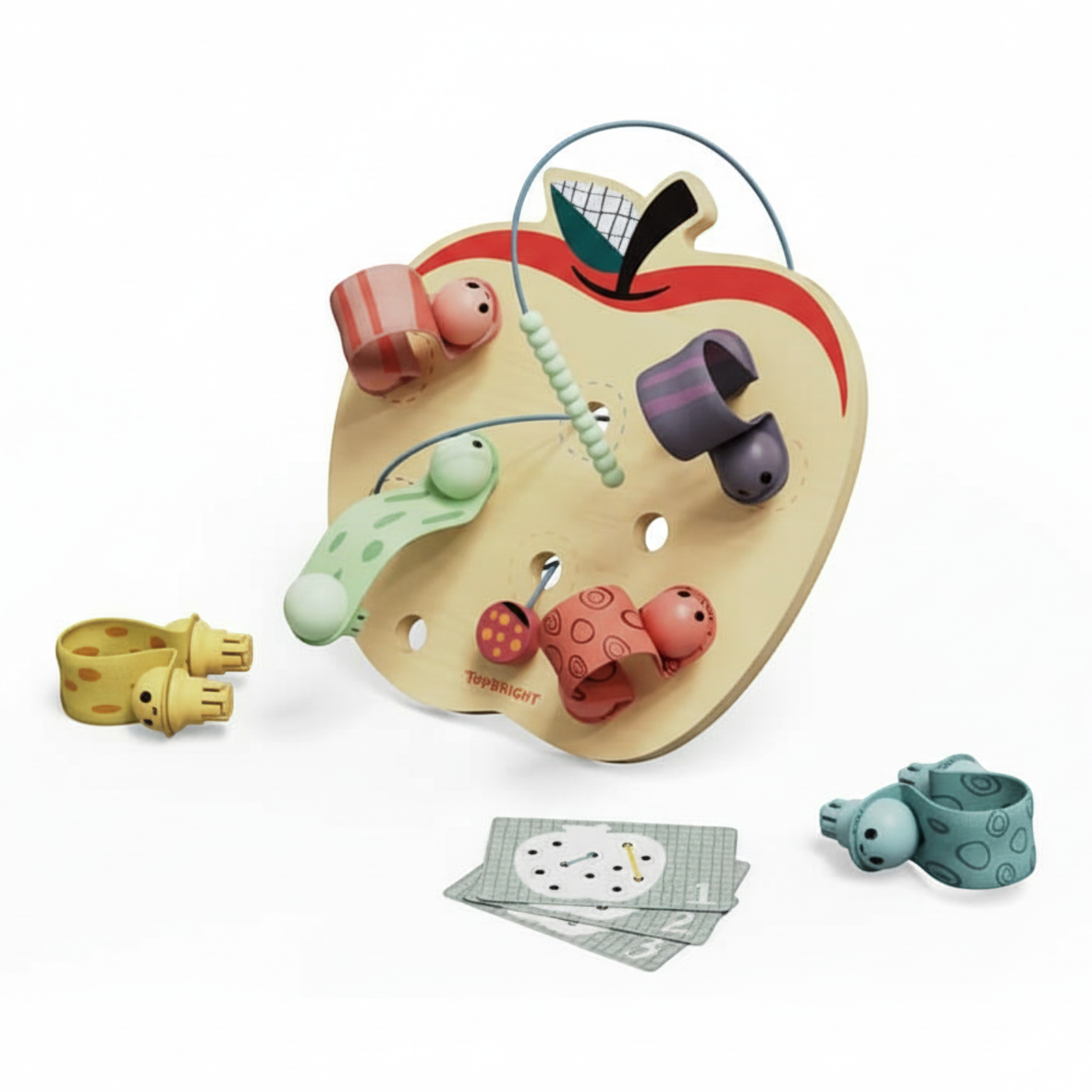 Dzięki zabawce edukacyjnej TOPBRIGHT półtoraroczne maluchy nauczą się odwzorowywać schematy zawarte na kartach do gry. Dzieci przekładają kolorowe owady przez otwory, układając je według wzorów. To połączenie zasad: gry w nawlekanie i gry w kołki. Dzieci albo przewlekają robaka na sznurku przez dziurki w jabłku, albo wkładają kolorowe robaki z kołkami do otworów. Zabawka jest prosta w obsłudze ale jednocześnie stanowi wyzwanie dla małej głowy.
