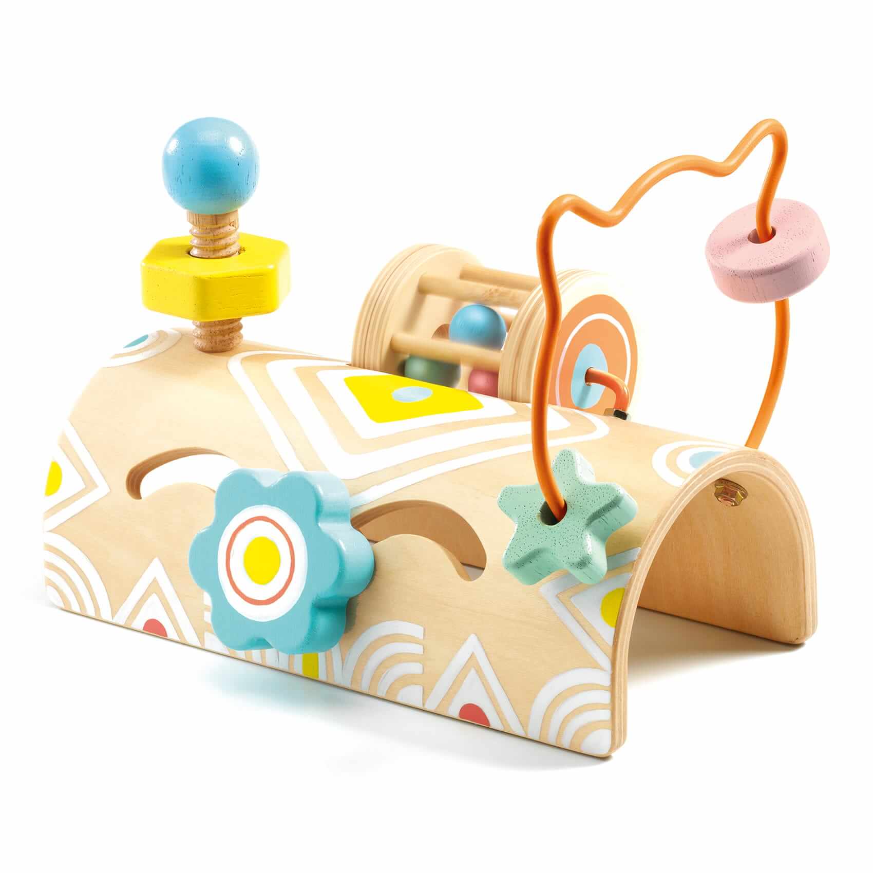 Złożona z różnych elementów: przewlekanki, wkręcając śrubkę lub okręcając kołem dziecko będzie się dobrze bawić. Ta zabawka zawiera kilka działań, które pobudzą każde dziecko do zabawy